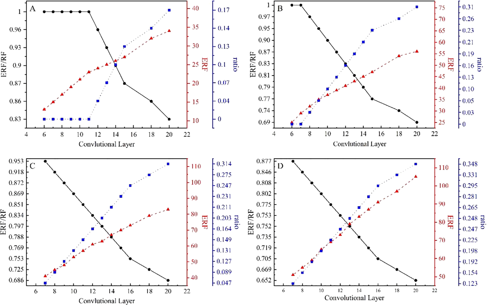 There are two ways to obtain the ERF: determining the maximum square range (Ding et al., 2022) containing the ERF based on Equation 6 or counting all pixel points within the range of the ERF in the experiment. To enable a comparison with the range of the RF, we chose the former scheme. We conducted the following experiments to determine the relationship among ERF, convolutional layer number, and kernel size. For the different convolutional kernel sizes, we tested the ERF, ERF/RF, and RF attenuation ratio (1-ERF/RF) for different convolutional layers. The results curves are shown in Figure 2.