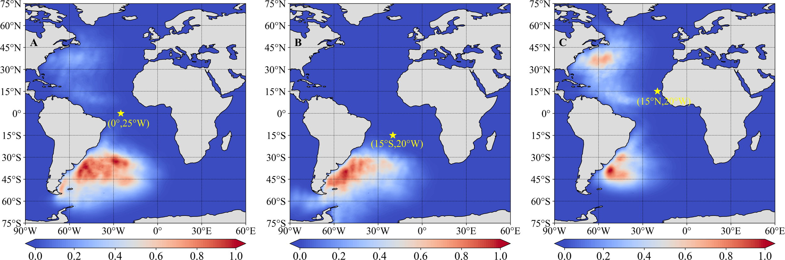 The gradient distribution can verify the characteristics of oceanic swell. We selected the West African area, where the wave conditions are complex and dominated by swells (Allersma and Tilmans, 1993; Toualy et al., 2015; Almar et al., 2023). The swells primarily arise from cyclones in the North Atlantic or storms in the Subpolar Westerlies of the Southern Hemisphere (Southern Atlantic and Southern Ocean). To verify swell-related areas in the West African area according to the improved model, we selected three points (0°, 25° W; 15° S, 20° W; and 15° N, 25° W) and their average values of gradient maps corresponding to all T − 168 moments from 2021 (Figure 4).