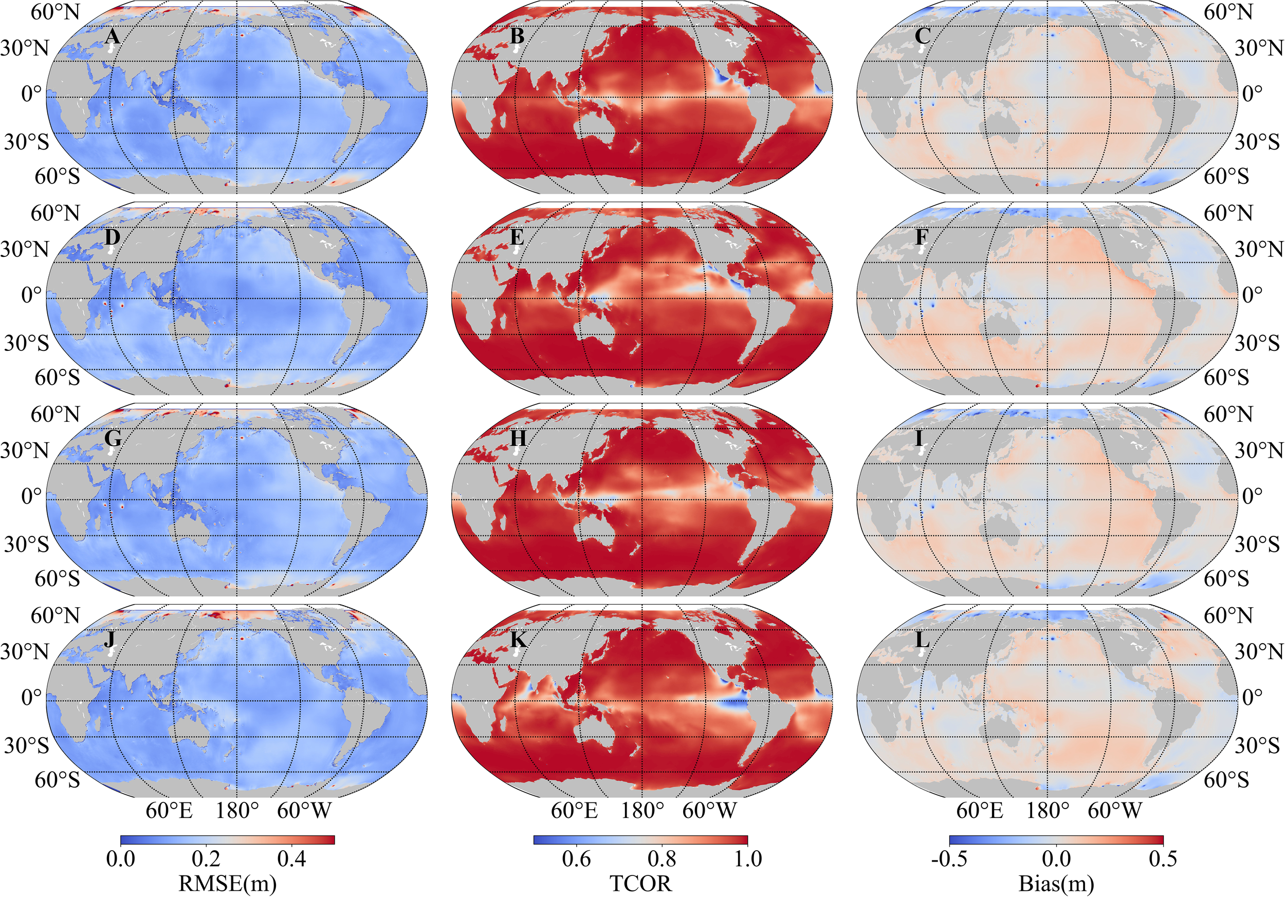 To evaluate the simulation results of the model, we used three indicators to judge the accuracy of global SWH: the time correlation coefficient (TCOR), root mean square error (RMSE), and bias (BIAS). These indicators can be calculated using Equations 9-11.
