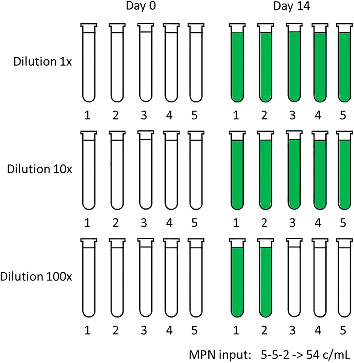 Example of the standard MPN matrix with three dilution factors: 1x (undiluted sample), 10x and 100x diluted sample. Each dilution is dispensed in five tubes with culture medium. The dilutions are made on day 0 when the incubation in the light is started. Tubes are scored positive if the measured chlorophyl-fluorescence on day 14 is greater than four times the standard deviation of the five initial fluorescence measurements of that dilution. In this example, two out of five tubes at 100x dilution are positive. Calculation of the total cell concentration is performed by inputting 5-5-2 in a MPN calculator or table, see Supplementary Table 1, which results in 54 c/mL with a lower-higher 95% confidence interval of 16-190 c/mL.