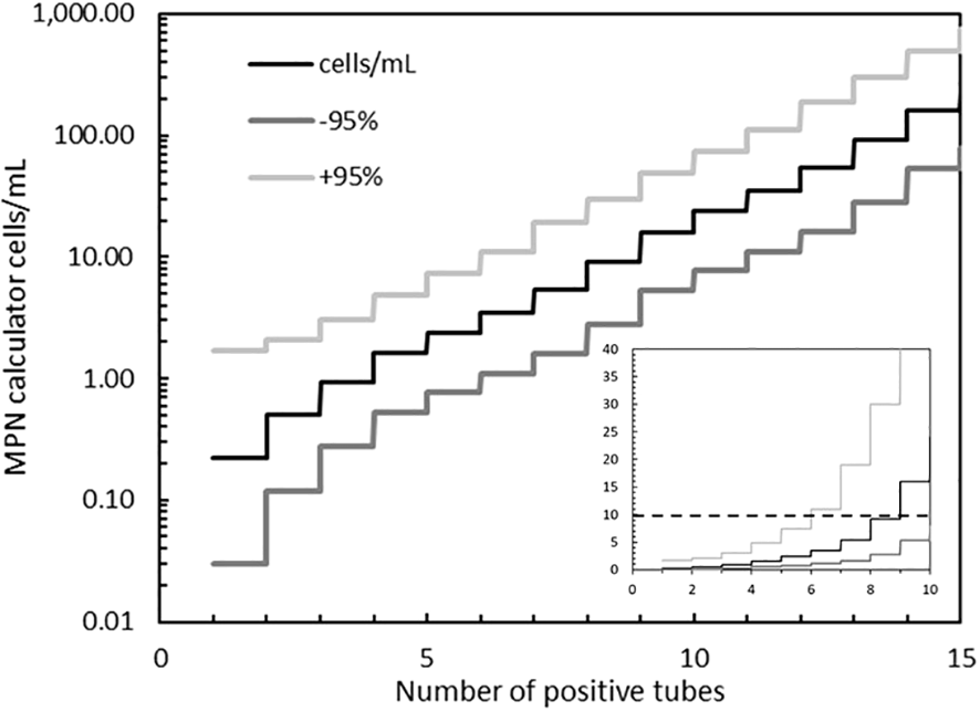 An approved, fast, and simple method to monitor growth after experimental manipulation is by measuring chlorophyll-fluorescence in multiple fluorimeter tubes (Brand et al., 1981; Peeters and Peperzak, 1990). MPN employs this method and the number of growth-positive tubes in the highest dilution is used to calculate the original sample cell concentration according to a table (Anonymous, 1939; Andersen and Throndsen, 2003), or an Excel™ calculator (https://standards.iso.org/iso/7218/) (Jarvis et al., 2010). Several old and new MPN tables and calculators are listed and compared in Supplementary Table 1. A detailed description of the MPN method is given by Andersen and Throndsen (2003). The MPN outcomes are stepwise concentrations, depending on the dilution factor and the number of tubes per dilution (Figure 2). This is in contrast to microscopic counting that has increments of 1 c/mL.