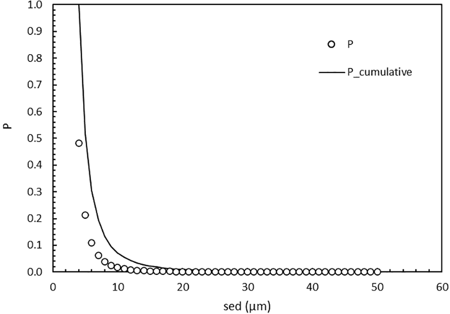The chance P (o) of finding a cell of a specific size (4 to 50 µm sed) as well as the cumulative chance (line) in the highest MPN dilution. The cumulative chance is the addition of chances of finding a cell at 50 µm and downwards. At sed = 4 µm, P_cumulative = 1.