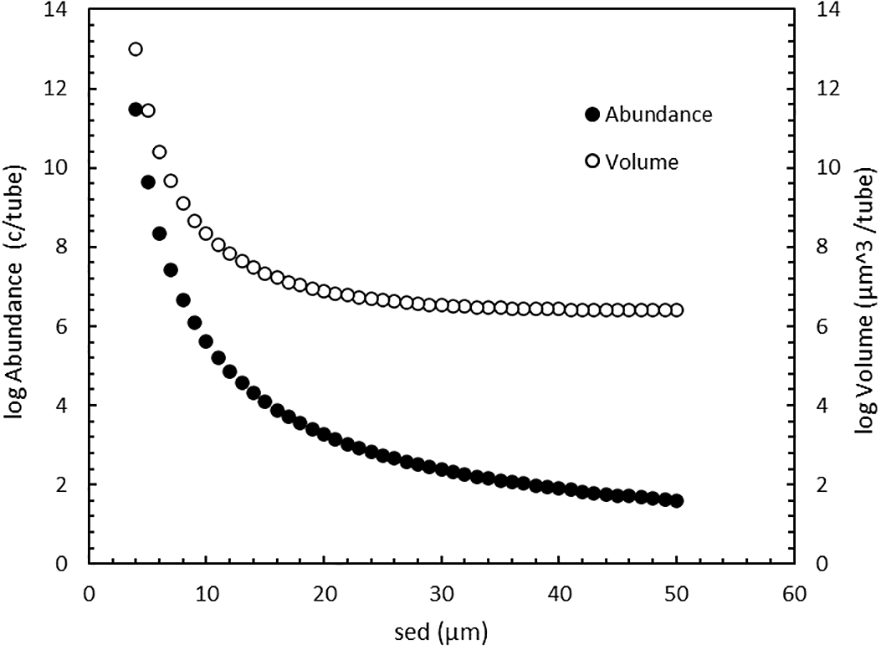 The PAS model shows that the cell concentration exponentially increases from 1 c/mL at the maximum size of 50 µm towards 400 c/mL at 10 µm and 106 c/mL at 1 µm (Figure 3). Practical experience in ballast water testing and analysis (Lundgreen et al., 2019) (Peperzak, unpublished) agrees that the number of small (near and below 10 µm) organisms is indeed much higher than larger ones (up to 50 µm). In fact, the origin of the MPN assay is to isolate and cultivate small phytoplankton (Knight-Jones, 1951; Throndsen, 1978). Using MPN, Knight-Jones (1951) measured concentrations in the 2 to 10 µm range of 1,000 up to 10,000 c/mL, which for his smallest cells (2 µm) is a factor of 10 lower than the PAS model. More recent data obtained by microscopy suggest that picoplankton (0.2 – 2 µm) concentrations are in the order of 105 to 107 c/mL (Fogg, 1986), which is in agreement with Figure 3. Although a natural water sample will not contain one species in every 1 µm model-increment, the data from Figure 3 will be used as a theoretical example.