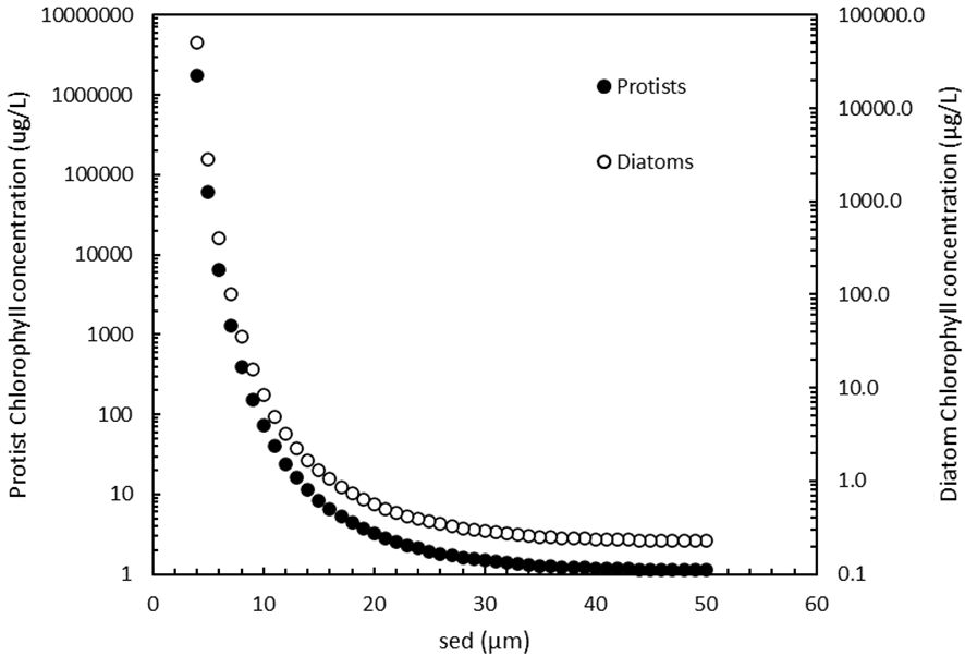 The frequently-used Turner 10-AU fluorometer in MPN assays has a detection limit of 0.025 µg/L in the lowest calibration range for extracted chlorophyll a using EPA Method 445.0. (https://www.turnerdesigns.com/10au-field-laboratory-fluorometer, assessed 1-11-2023). Figure 6 shows that the minimum chlorophyll concentrations are 1 µg/L and 0.2 µg/L for the largest protists and diatoms respectively, both above the detection limit. To compare the values in Figure 6 with real world data: in eutrophic coastal Dutch waters the maximum chlorophyll concentrations in diatom-Phaeocystis blooms were between 100 and 200 µg/L (L. Peperzak, unpublished). In Figure 6, values above 200 µg/L are reached by small (<10 µm) cells. Although such high chlorophyll concentrations (>1,000 µg/L, Figure 6) in an MPN tube are unrealistically high it is clear that, according to the model, cells of all sizes can be detected in the standard MPN by a fluorometer.