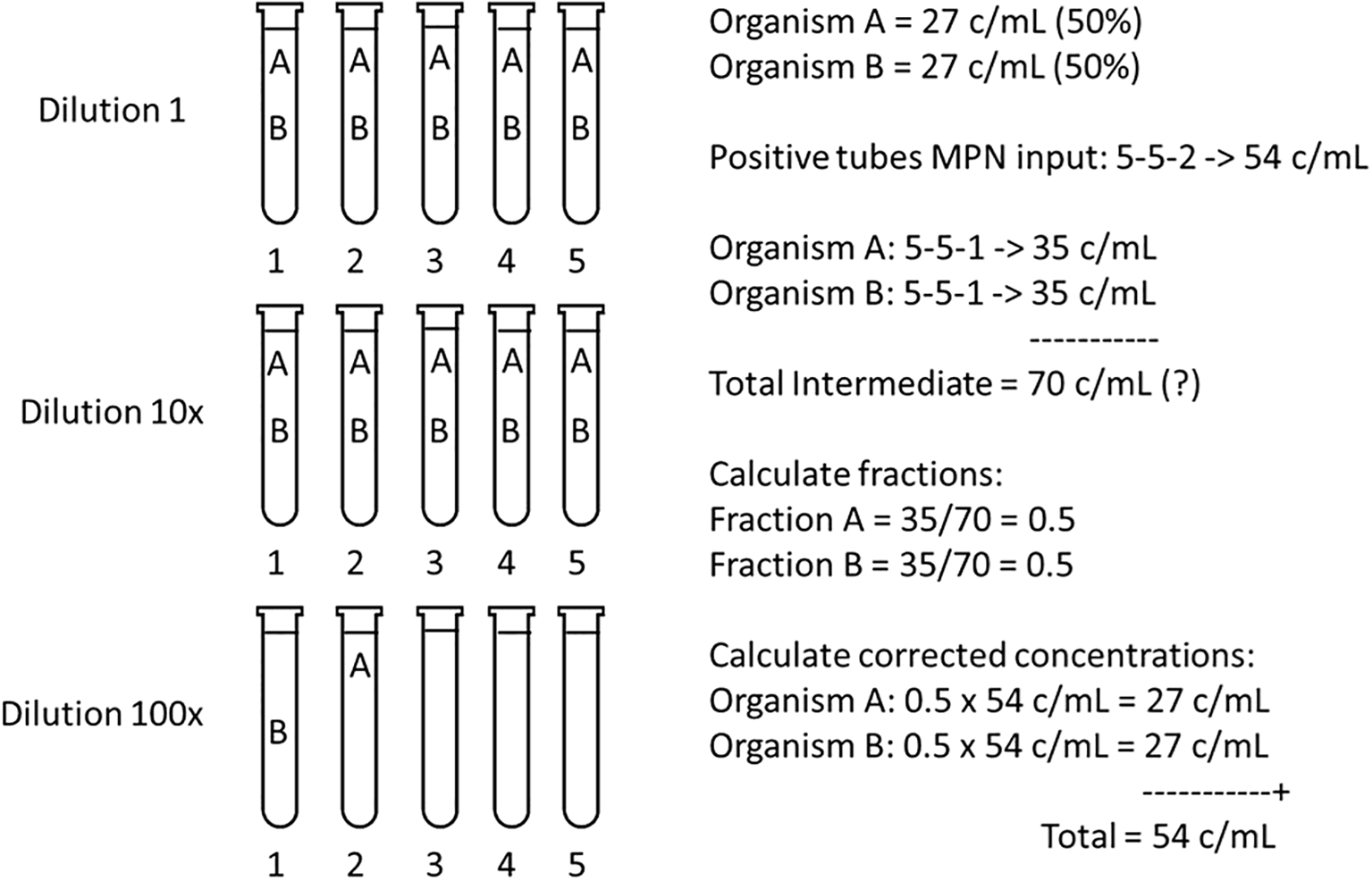 How to calculate concentration of B if this is the species of interest? What lies in reason, and has been common practice, is to discard one tube (here with species A) and to perform a new MPN calculation for species B using scenario 5-5-1, which yields 35 c/mL. Naturally, if the calculation is repeated for A (also with 5-5-1) this also yields 35 c/mL. This seems correct because both species were present in equal amounts (each one tube in the final dilution). However, the total of A and B then would be 70 c/mL, which cannot be true because the total MPN is 54 c/mL.