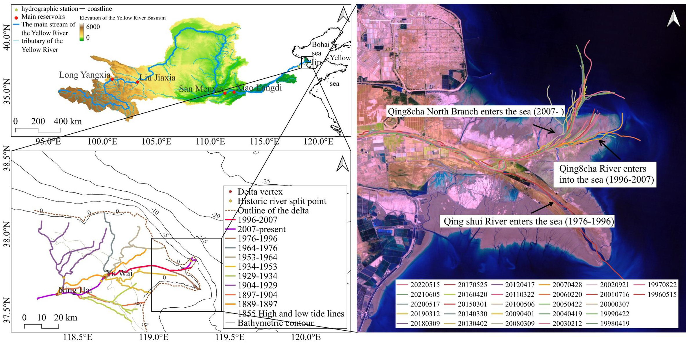 The main stream of the Yellow River Basin, major reservoirs, hydrographic stations, and the development of leaf flaps and diversion of flow paths in the Yellow River Delta in modern times (1855-).