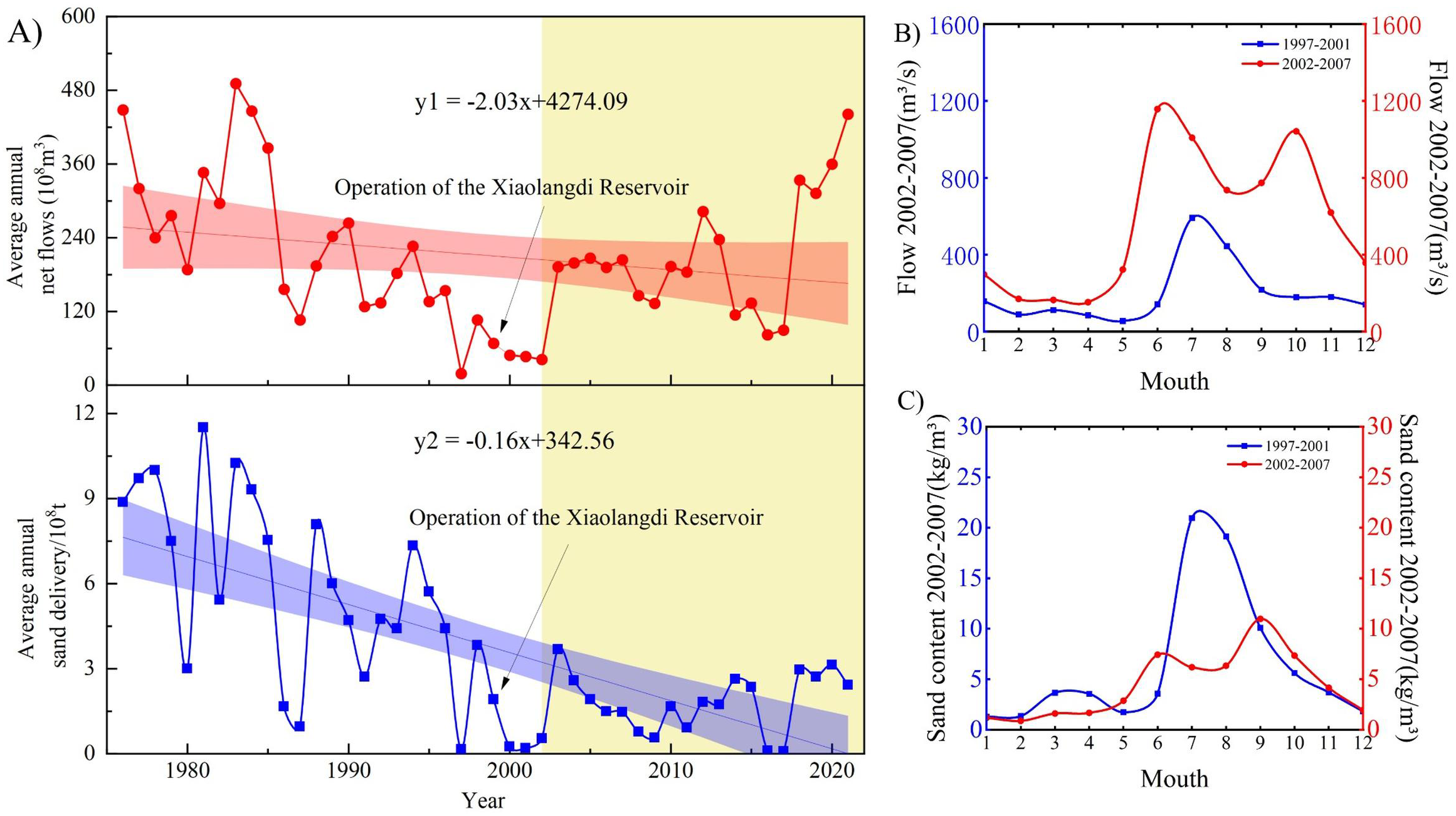 Changes in water-sand entering the ocean (A) Changes in mean annual total water-sediment transport, 1975-2022 (B) Changes in mean monthly flow, 1997-2007 (C) Changes in mean monthly sand content, 1997-2007.