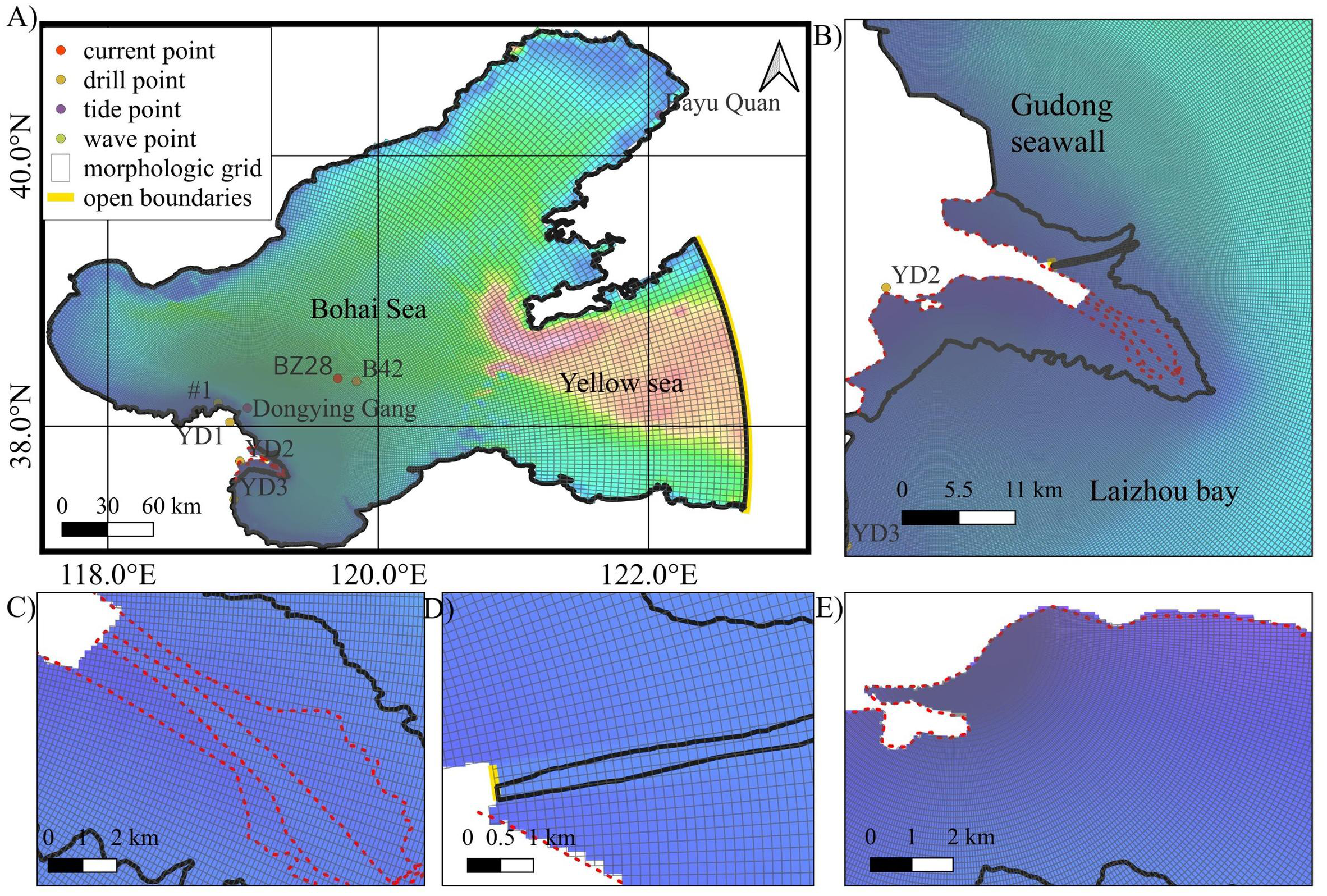 Grid setup and interpolated topography (A) Model computational domain and coordinates of point locations (B) 1997 nearshore topography of the Yellow River delta (C) sand spit in the abandoned Qingshuigou sub-delta (D) 1997 river topography (E) tidal flats in the southern part of the Qingshuigou sub-delta.