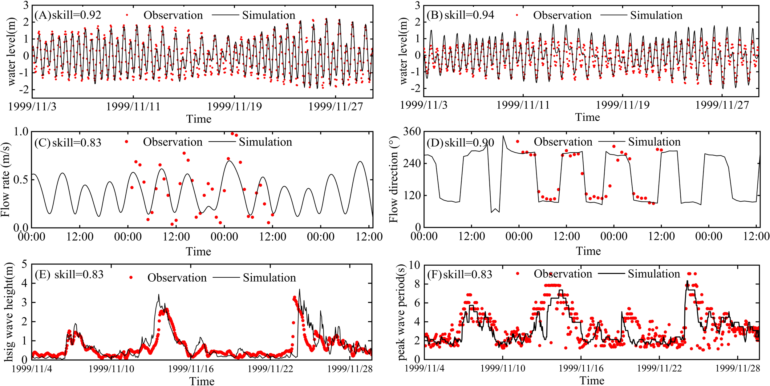 Comparison of hydrodynamic validation model results (black line) with observations (red dots). (A, B) Tide level validation results at Bayu Quan and Dongying Gang, (C, D) Depth-averaged flow velocity and flow direction validation results at point BZ28, (E, F) Wave height and spectral peak period validation results at point #1.