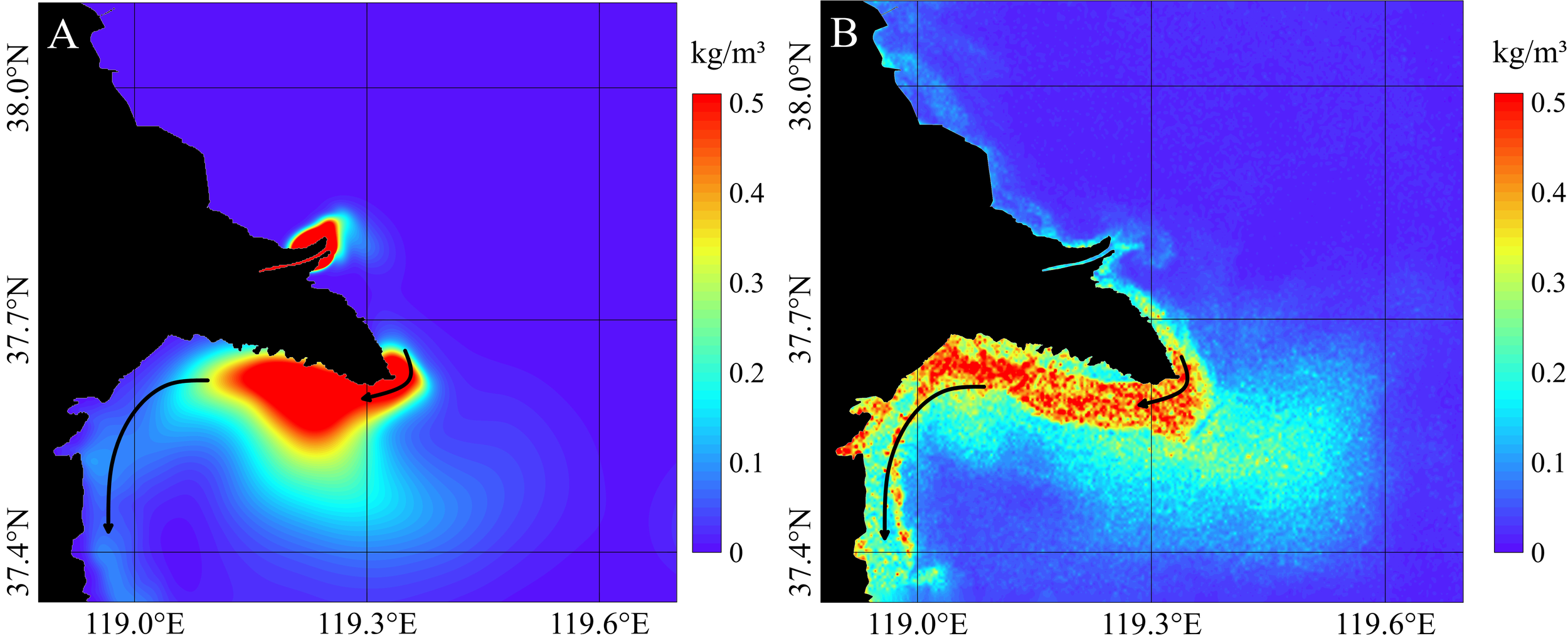 Validation of suspended sand concentration patterns. (A) Modeled suspended sand results (B) Remote sensing image suspended sand inversion results.