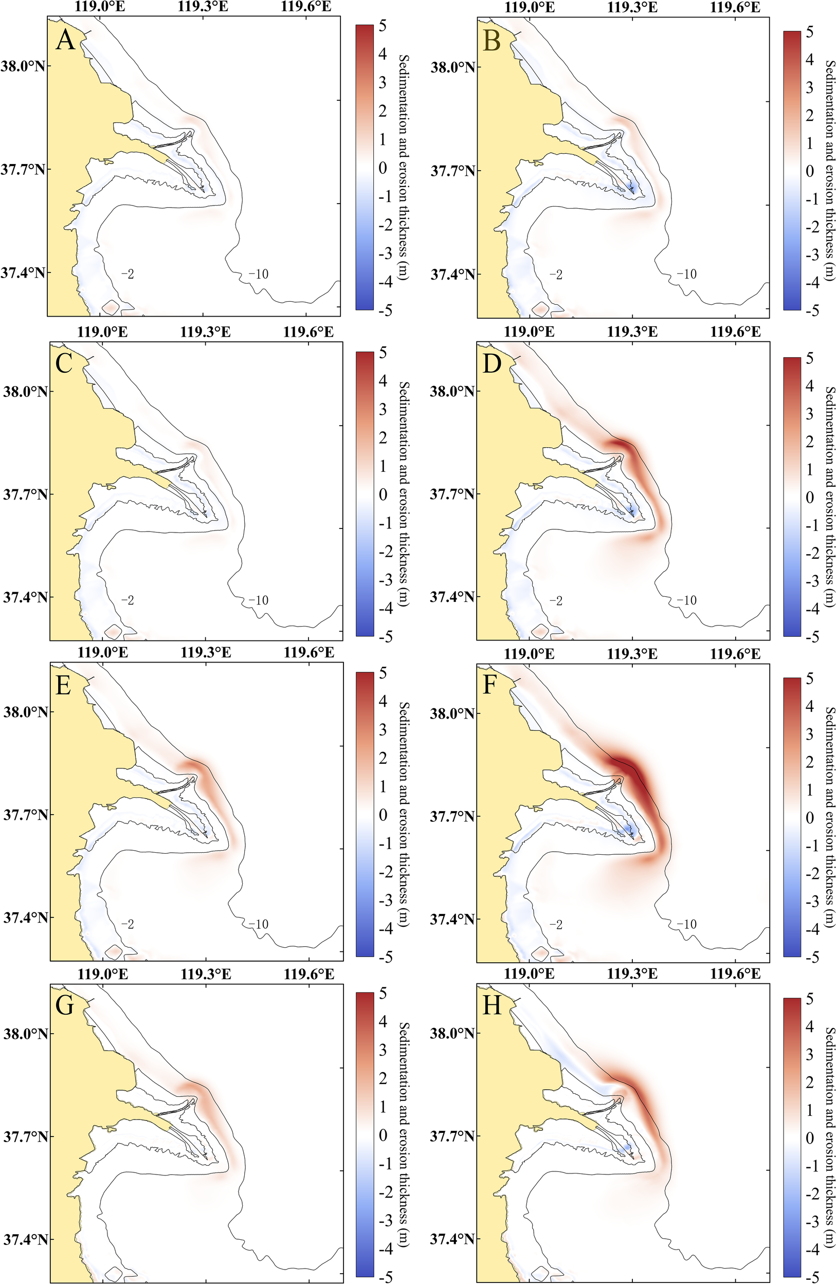 Spatial distribution of erosion/accretion in the Qingshuigou Subaqueous delta relative to 1997, bottom panel shows initial topography for model calculations (A) (Run1) 5-year change in erosion and accretion 1997-20021 (B) (Run1) 5-year change in erosion and accretion 2002-2007 (C) (Run2) 5-year change in erosion and accretion 1997-2001 (D) (Run2) 5-year change in erosion and accretion change 2002-2007 (E) (Run3) 5-year change in erosion and accretion 1997-2001 (F) (Run4) 5-year change in erosion and accretion 2002-2007 (G) (Run3-Run2) 5-year change in erosion and accretion 1997-2001 (H) (Run4-Run2) 5-year change in erosion and accretion 2002-2007.
