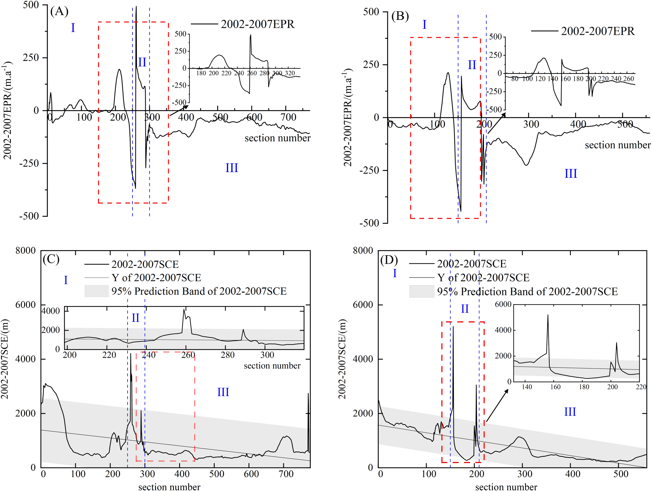 The change of isobath reflects the determining effect of dynamics on geomorphology and the feedback effect of geomorphology on dynamics, and the spatial distribution difference of the dynamical geomorphological state is evaluated by studying the stability of 0m isobath in the sub-delta area of Qingshui Gou. The study investigated the spatial and temporal change process of the shoreline of the abandoned sand spit, and divided the abandoned sand spit into three sections, namely, the northern part of the abandoned sub-delta (section I), the abandoned estuary section (section II), and the southern part of the abandoned sub-delta (section III), and generated 777 cross-section lines and 550 cross-sections with DSAS (Figure 8), and the formulae of the EPR indexes and SCE indexes for the period from 2002 to 2007 are as follows: