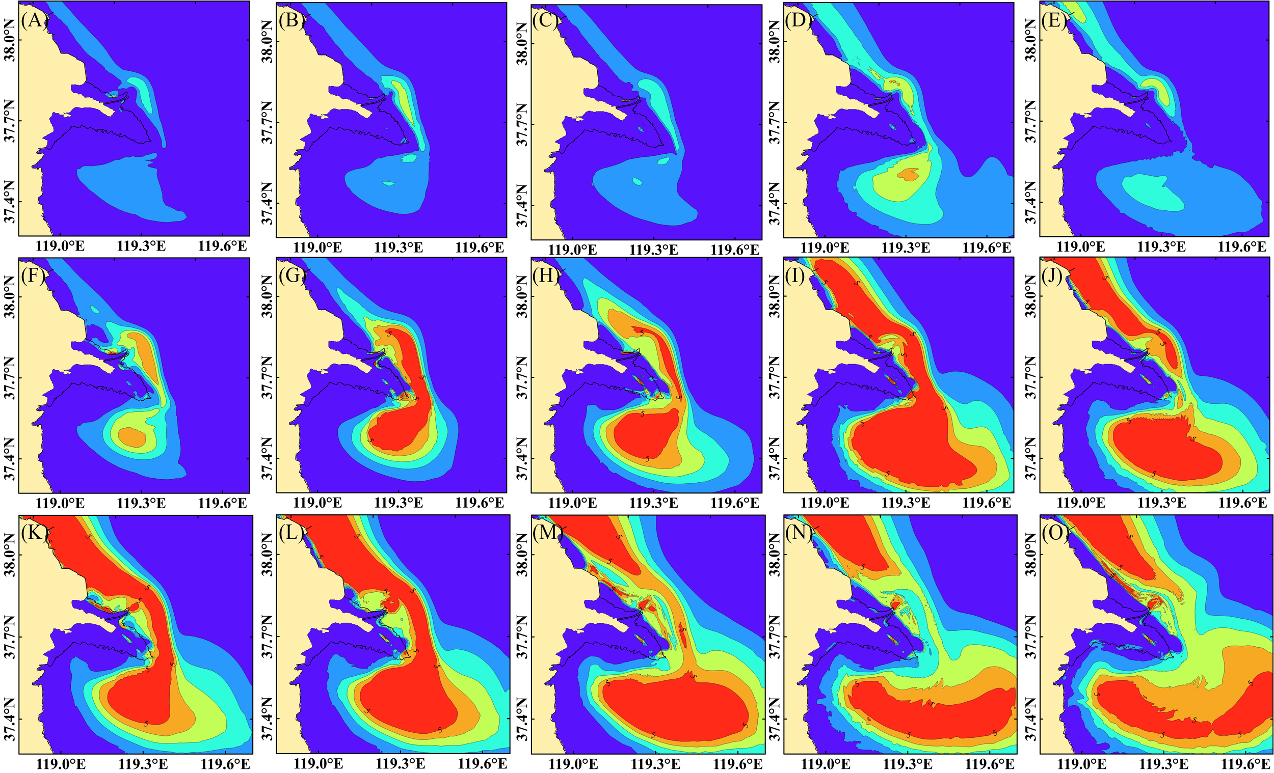 Compared to the Run 4 scenario, the 0.1kg/m² and 1kg/m² contours extended into the upper intertidal zone in the southern part of the abandoned delta. In addition, the 1kg/m² and 3kg/m² contours show a significant amplification of radioactivity in Laizhou Bay.