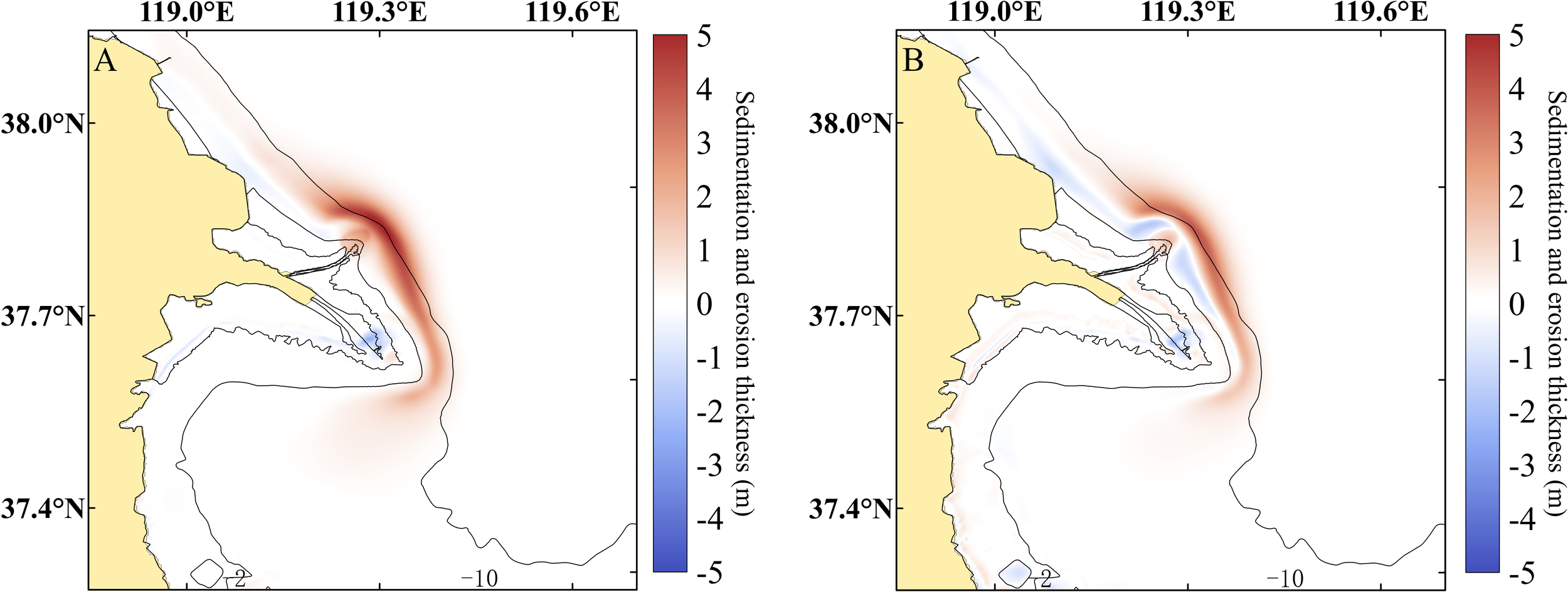 In comparison to the current extensive deposition around the estuary, the tidal flats in the northern part of the Yellow River Delta exhibit a slight erosion state, with a maximum erosion depth of 5.52m over a 10-year period. From the Gudong seawall to 6,000m south of the abandoned sand spit along the 0m isobath, a strip erosion state is observed, with a width of the strip ranging from 4,000m to 6,000m. The overall arc of erosion around the abandoned sand spit may be attributed to the shape of the estuary protruding and the strength of the tidal currents along the shoreline. The maximum erosion depth is 2.21m and is located near the fore edge of the abandoned channel at 6600m. In the area of the delta front edge, the difference between the unsteady scenarios Run2 and Run4 is considerable. The minimum, mean and maximum values reach -3.01m, 1.76m and 4.03m, respectively. As we move seaward, the difference gradually decreases and almost disappears at the isohaline depth of 16m (<0.1m).