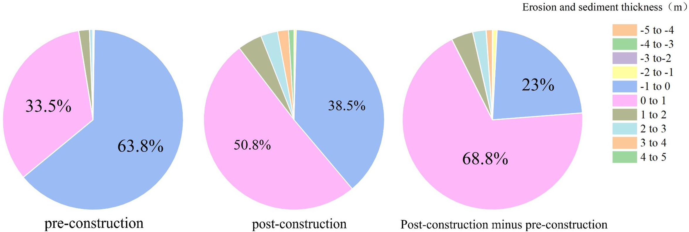 Scale maps of erosion and depositional areas in the study area differ significantly before and after the construction of the project, revealing the profound impact of human activities on the evolution of the regional geomorphology. Before construction, the area proportion of erosion (thickness -1-0m) reached 63.8%, indicating that the study area is dominated by erosional processes. While the total area of accretion (sediment thickness 0-1m) is 35.5%, the proportion of other thickness ranges is negligible. After construction, the proportion of sedimentary area increased to 50.8%, indicating an enhancement of sedimentary processes; meanwhile, the proportion of erosive area decreased to 38.5%. This reflects that construction activities intensified the erosion process and inhibited the expansion of accretion. In the pre- and post-construction comparisons (Figure 12), the area of deposition (0-1 m thickness) increased by 68.8%, while the area of -1 to 0 m erosion increased by 23%. This difference suggests that construction activities weakened the spatial distribution of erosional processes to some extent and is associated with altered dynamical conditions and sediment redistribution (Figure 10).