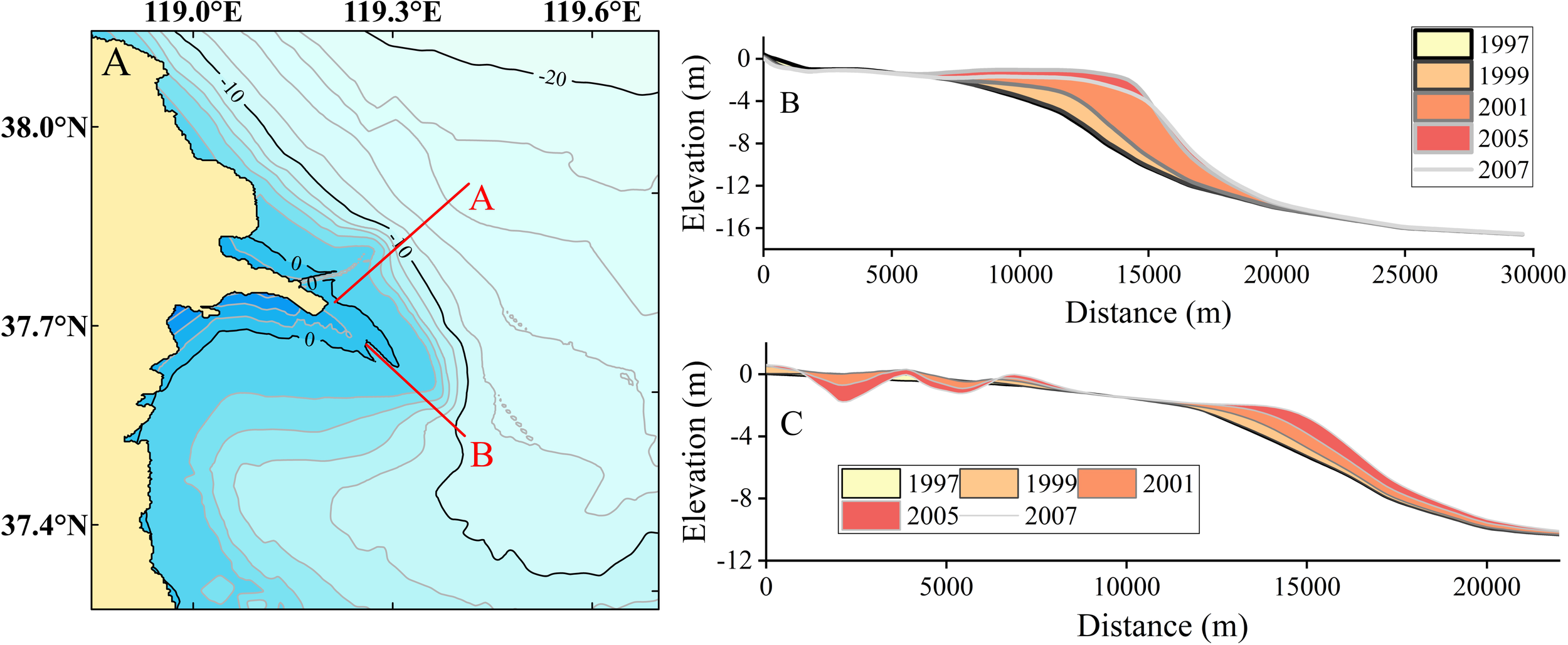 For Section B (Figure 13C), which spans the inner delta and nearshore areas (Figure 13A), the 1997-2001 period showed localized accretion and overall stability in elevation. However, after 2002, significant erosion occurred in nearshore areas (2,000 to 8,000 meters from the river mouth), with elevation dropping markedly. The thickness of sedimentation in the outer delta remained more or less the same in 2001-2005 and 2005-2007, indicating that the sedimentation process was relatively stable during these two periods. This phenomenon may have been influenced by a combination of the persistence of residual sediment transport and the modelled acceleration factor, so that the sedimentation process in the outer delta region did not weaken significantly, as expected, but remained at a certain level of intensity.
