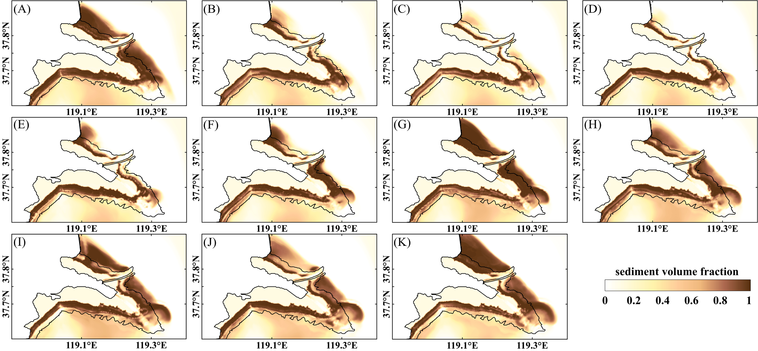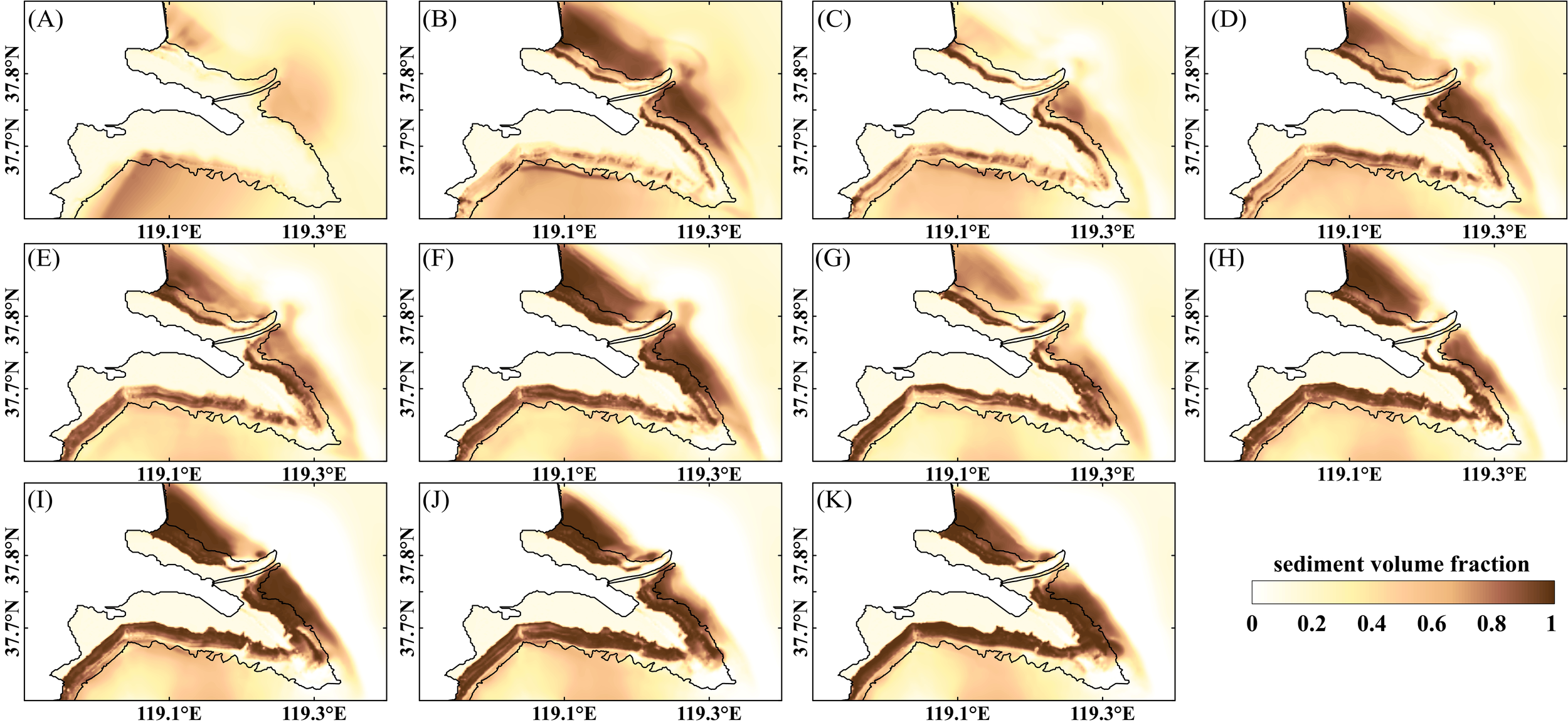 The SSC(Suspended Sediment Concentration) remote sensing inversion model developed by the previous authors demonstrated the robustness of the algorithm and its applicability in the Yellow River estuary waters (Fan et al., 2007). Consequently, the study was employed to validate the spatial pattern of the sediments by comparing the model results with the remote sensing inversion results. The spatial pattern of sediments simulated by the model, including spatial extent and deflection, is largely consistent with the previous inversion results (Figure 5). However, some discrepancies were observed near the large mudflats in the southern part of the delta, which can be attributed to the lack of precise characterisation of the properties of different sediments, such as sortability and erosivity, and the spatial distribution of initial sediment fractions.