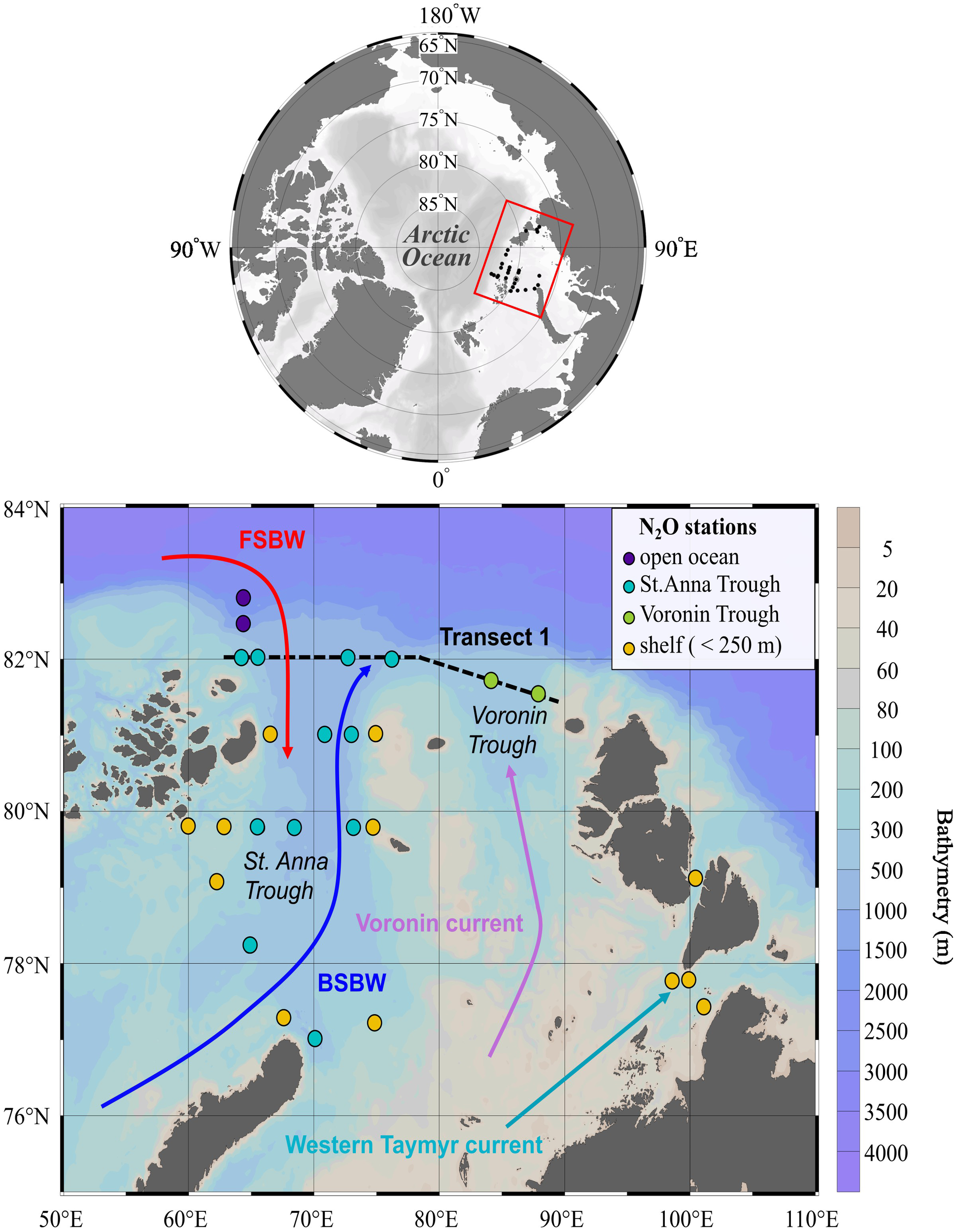 N2O sampling stations in circles, categorized by location and depth. Open ocean stations (in dark blue) are beyond the continental shelf (>2000 m depth), shallow shelf stations (in yellow) have a depth <250 m, and St. Anna (in light blue) and Voronin Trough stations (in green) are on the continental shelf (>250 m depth). Water circulation is indicated by colored arrays representing the Fram Strait Branch Water (FSBW), the Barents Sea Branch Water (BSBW), the Western Taymyr and the Voronin current. This circulation is further supported by the geostrophic current field shown in Figure 2. Squares on transect 1 represent additional profiles of temperature (white squares) and nutrients (black filled squares).