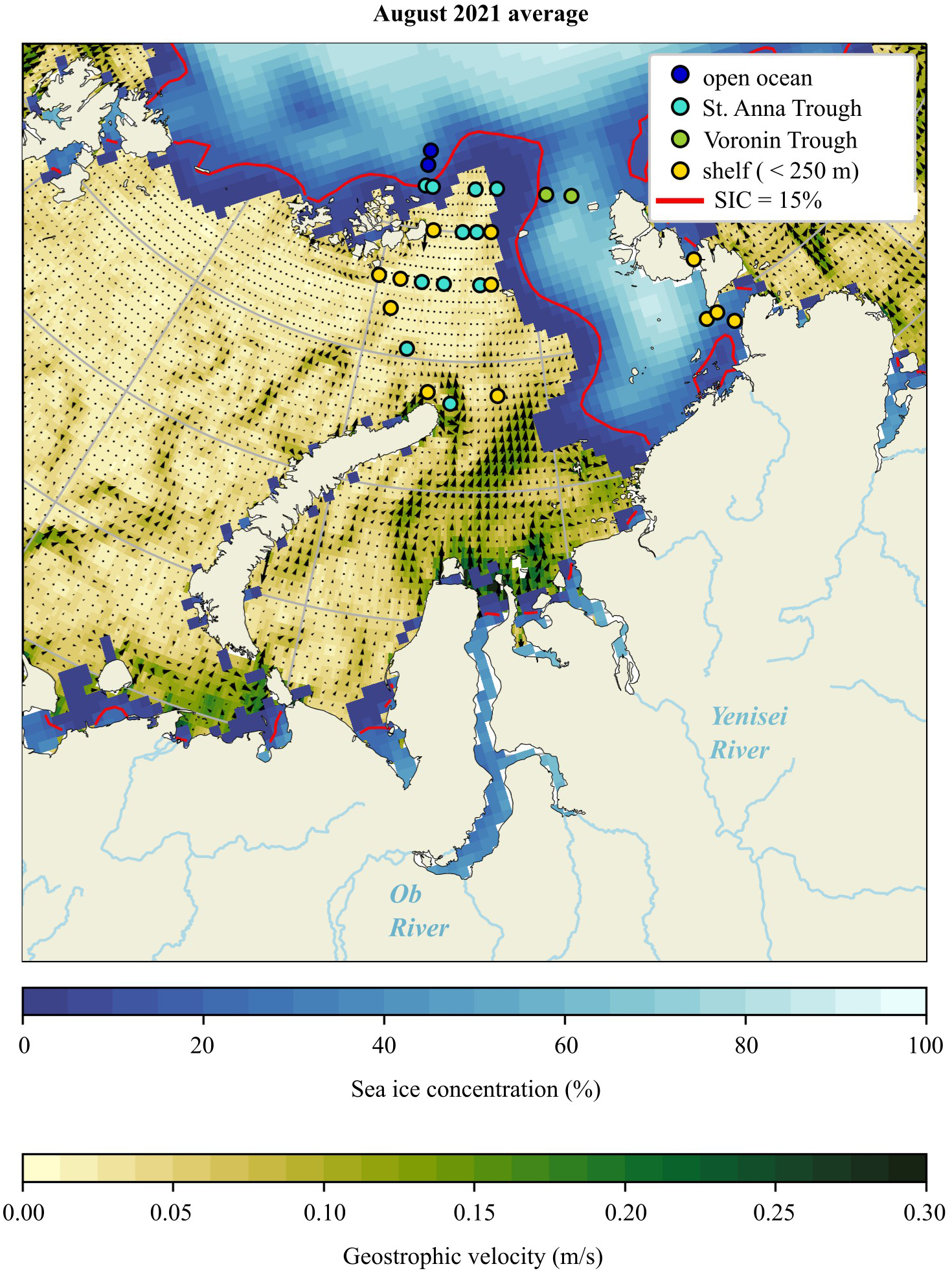 The Kara Sea, like most eastern Arctic marginal seas, is distinguished by its extensive and shallow continental shelf, and is seasonally covered by sea ice (Figures 1, 2). Perpendicular to the shelf break, the continental shelf exhibits two distinct troughs: the St. Anna Trough to the west, reaching a maximum depth of 620 m, and the Voronin Trough to the east, with a maximum depth of 450 m (Figure 1). The overall circulation in the Kara Sea is characterized by a semi-cyclonic pattern. Waters of Atlantic origin enter the Kara Sea via the Fram Strait Branch Water (FSBW) from the northwestern side of the St. Anna Trough, flowing southwards. Simultaneously, the Barents Sea Branch Water (BSBW) enters the western side of the St. Anna Trough, flowing northwards (Figure 1). The area also receives substantial river discharge from the Ob and Yenisei, accounting for approximately 40% of the total river runoff in the Arctic Ocean (Aagaard and Carmack, 1989; Makkaveev et al., 2015). The resulting river plume typically flows eastward along the Siberian coast (Figure 1) (Janout et al., 2020).