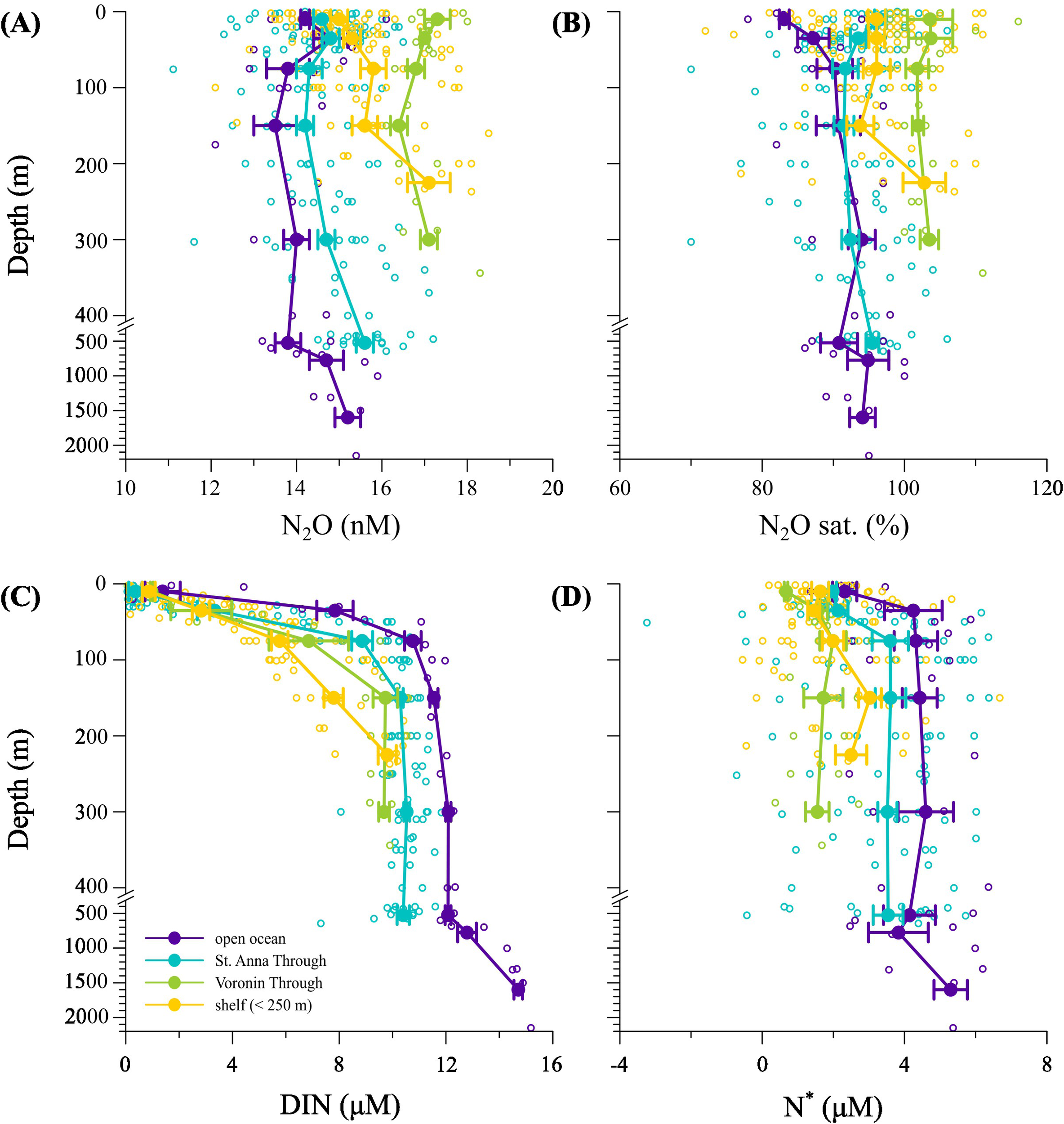 N2O (A), N2O saturation (B), DIN concentration (C) and N* concentration (D) vs depth. Empty circles represent the individual samples and the lines with filled circles represent the mean concentrations of each group of stations as defined in Figure 1, at specific depth ranges (0 m – 20 m; 20 m – 50 m; 50 m – 100 m; 100 m – 200 m; 200 m – 400 m; 400 m – 650 m; 650 m -1000 m; 1000 m – 2200 m). Each averaged point is calculated from at least three samples, except for the DIN surface point of the Voronin Trough (0 m – 20 m), that was calculated from two points due to lack of data. The error bars represent the standard error.