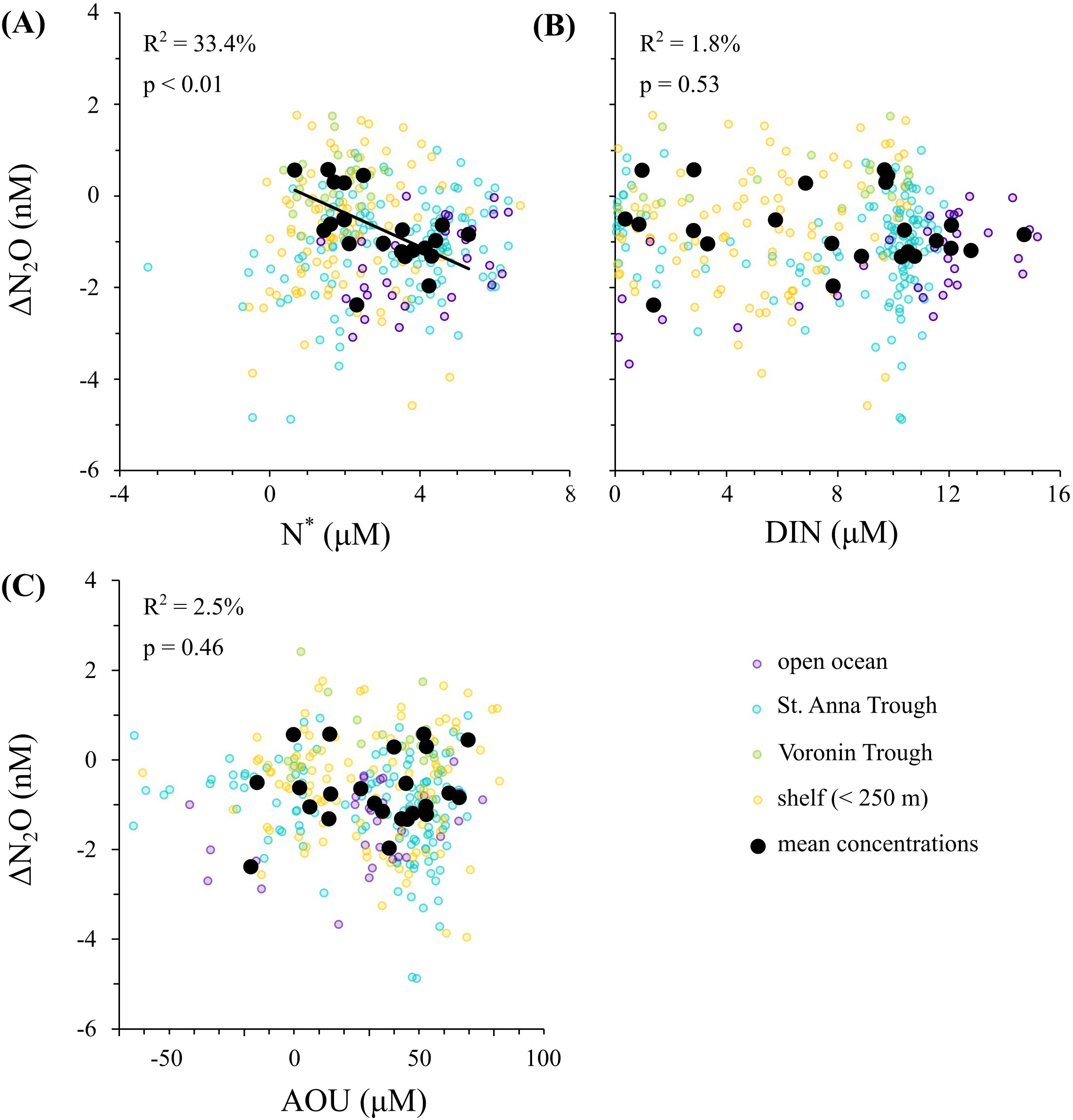 N2O versus N*(A) and DIN (B), and ΔN2O versus AOU (C). Small circles represent individual samples, and the big filled black circles represent the mean concentrations of the samples, as described in Figure 2. Regression lines are shown where there is significant statistical correlation between the mean concentrations.