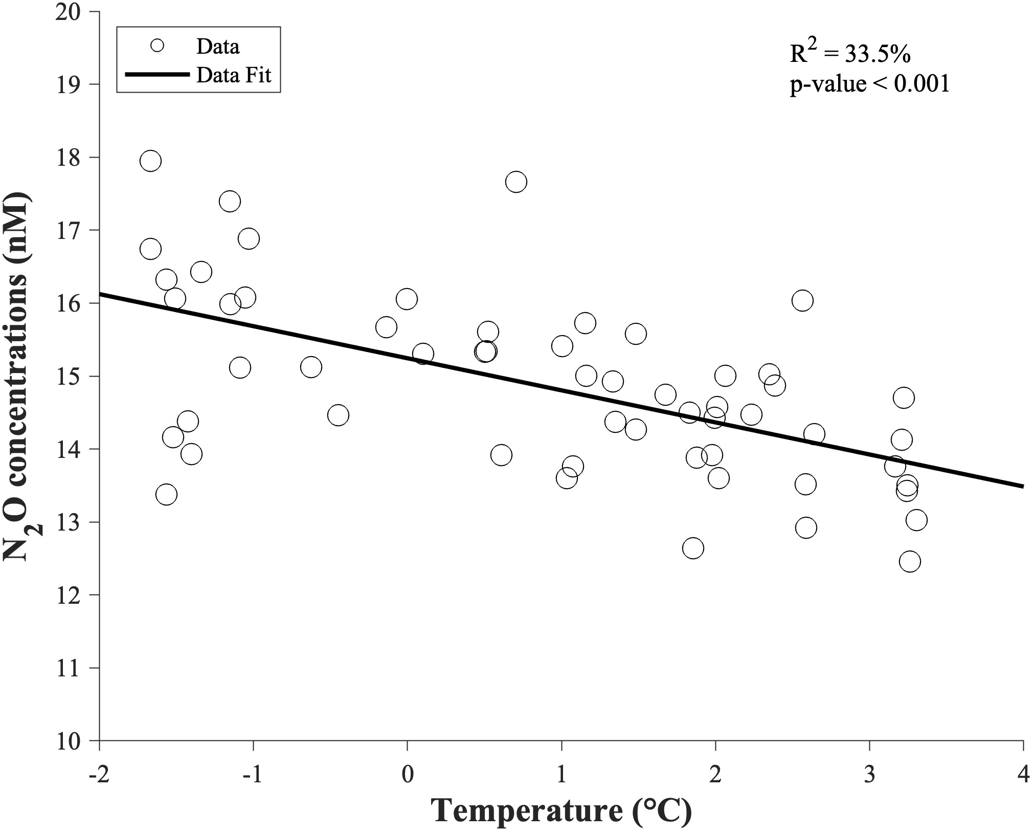 N2O concentrations in the mixed surface layer. The N2O concentration is compared to temperature. The regression line is shown in black.