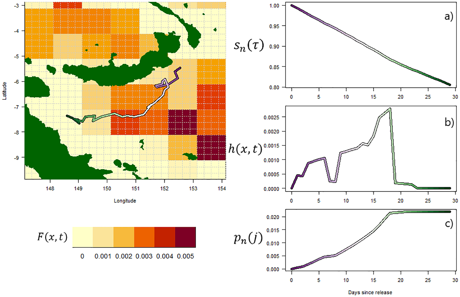 In our model, where individuals are recovered dead, this probability of recapture at an individual level will necessarily asymptote with increasing individual time-at-liberty τ, as additional exposure of an individual to recovery effort will result in decreasing chance of recapture due to the preceding natural mortality, and fishing mortality associated with past effort. An individual movement trajectory from Ikamoana is given in Figure 1, demonstrating how movement through a heterogeneous field of fishing mortality influences survival and recapture probability over time. Using this individual-level and probabilistic approach to generate a recapture probabilities through time, it is then straightforward to generate simulated recapture data over a given time window.