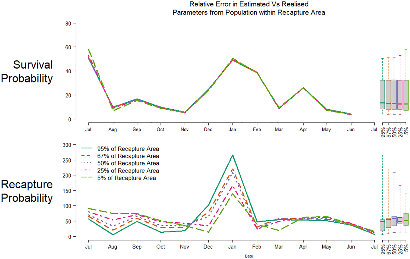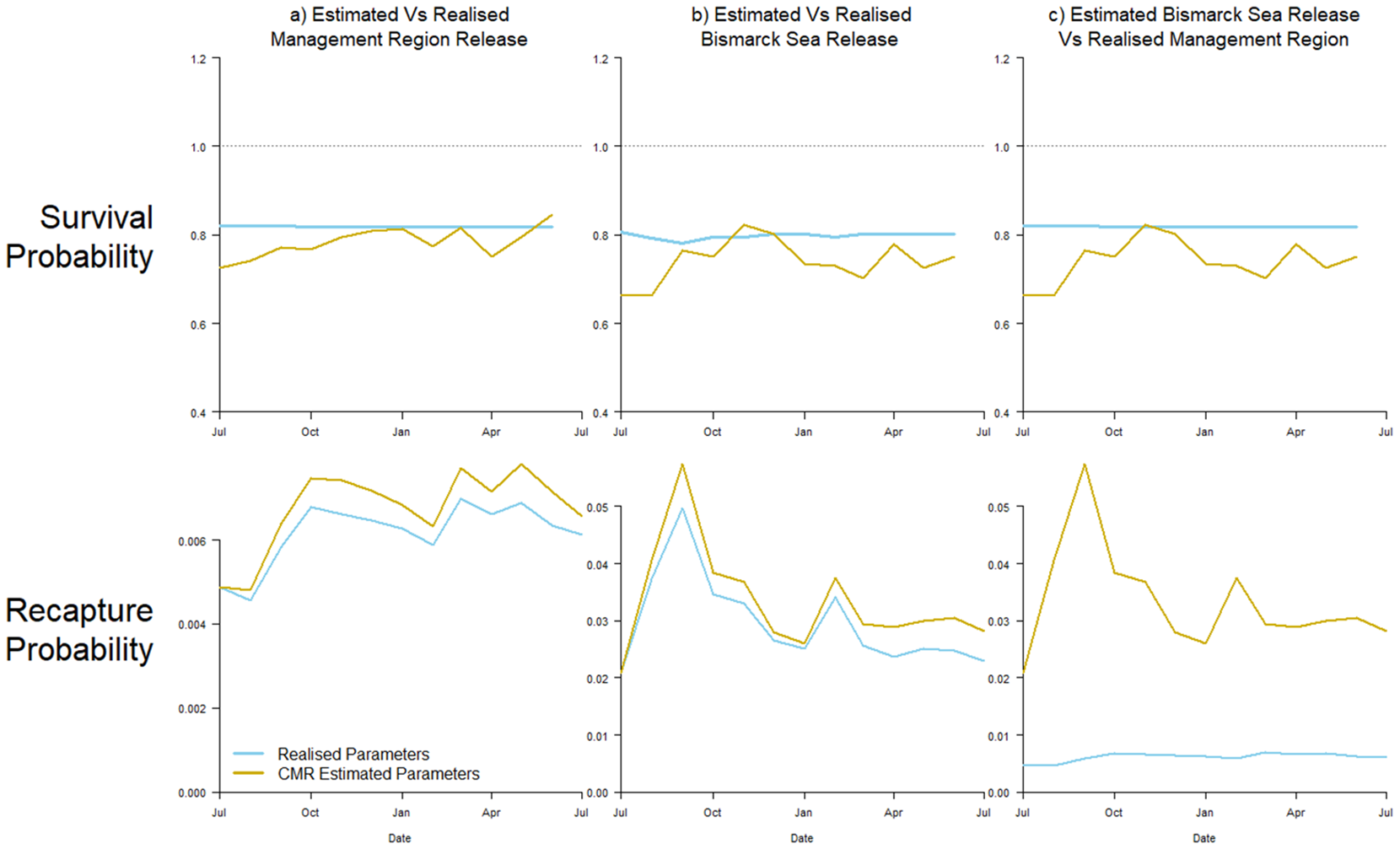 To examine the parameter bias, we compare the estimates from the Brownie model to the equivalent, realised survival and probability of recapture , over time period j, from the simulated marked and unmarked groups. Realised values are the sum of values across all individuals currently at liberty N, weighted by the probability of those individuals having survived prior to time period j. Using Equations 2, 4: