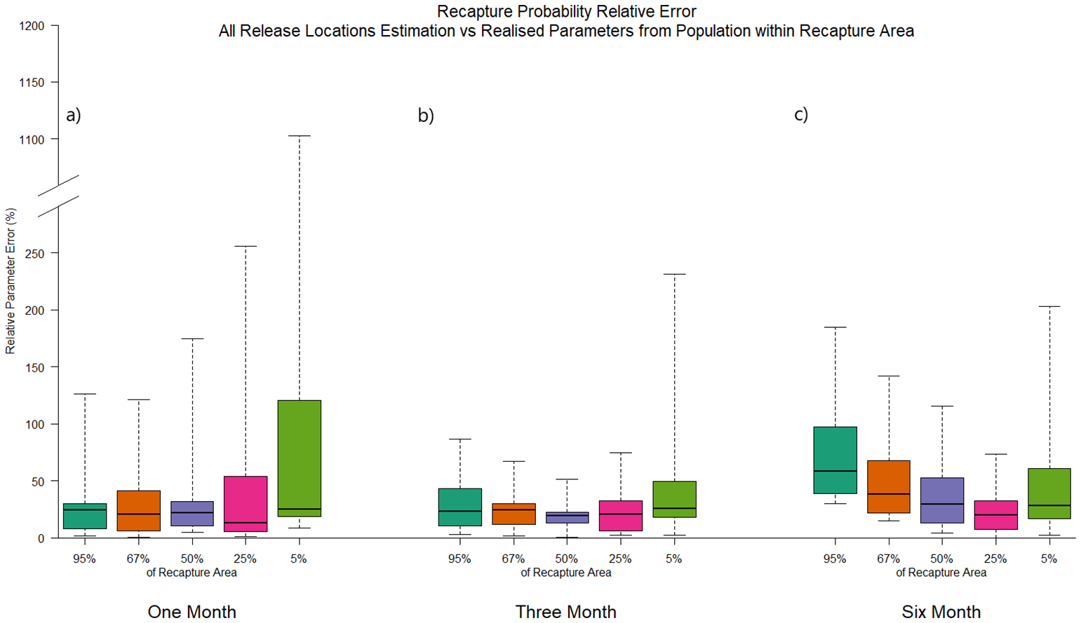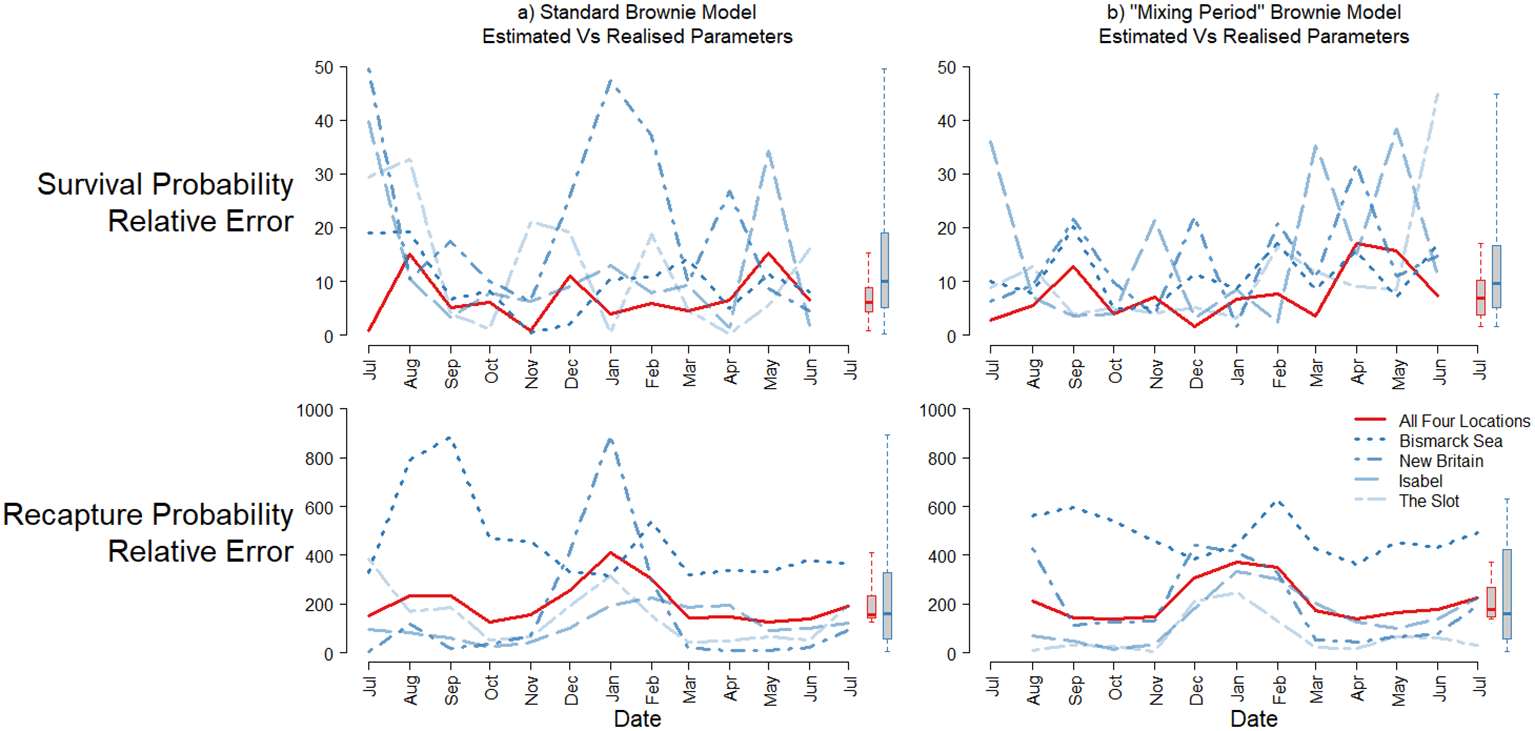 Once again, probability of survival was reasonably well estimated (median, relative bias over time = 9.3%), although fish released in the Bismarck Sea produced a larger, negative bias in these estimates compared to the ‘true’, realised survival of the unmarked population. However, recapture probability estimates were severely overestimated and highly variable, with a median value of 361% greater than that of the unmarked population over time (Figure 3C).