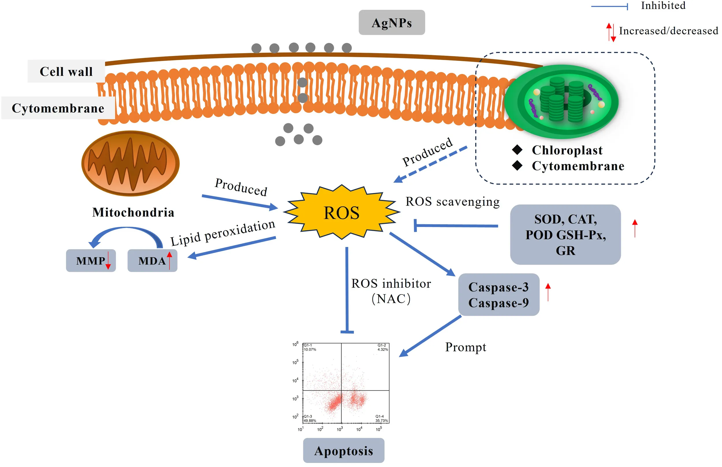 The findings reveal that AgNPs induce apoptosis in P. tricornutum cells by triggering a mitochondria-mediated pathway, marked by a decrease in mitochondrial membrane potential and the activation of caspase enzymes. Additionally, AgNP exposure results in an overproduction of reactive oxygen species (ROS) within the algal cells, leading to lipid peroxidation of the cell membrane and a consequent increase in malondialdehyde (MDA) levels. This oxidative stress response induces the upregulation of antioxidant enzyme activities in an attempt to mitigate the excessive ROS.