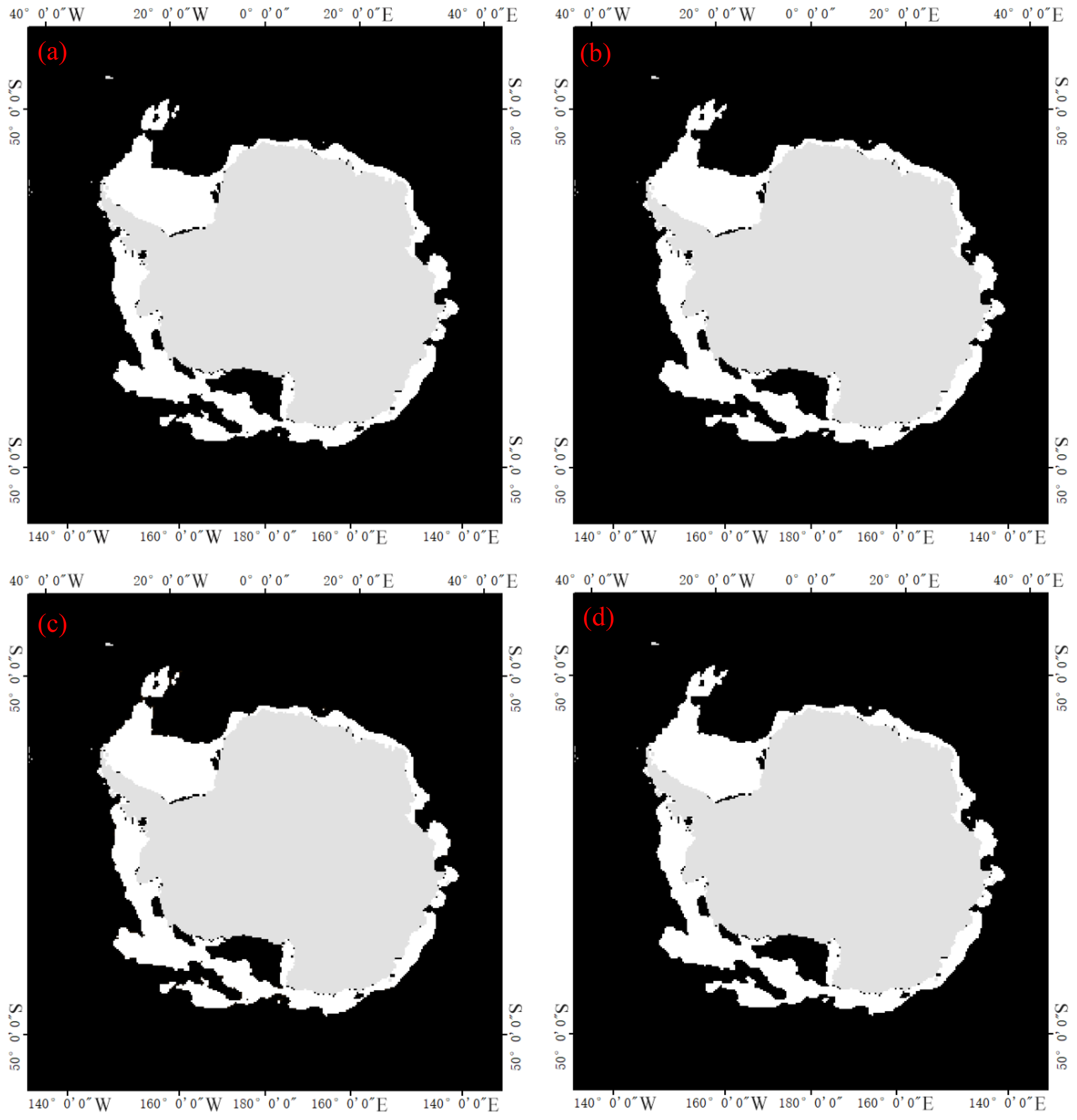 Results of different sea ice distribution detection algorithms (A) Improved ant colony algorithm, (B) Iterative algorithm, (C) Maximum entropy algorithm, (D) Basic global threshold algorithm (White represents sea ice regions, while black represents non sea ice regions).