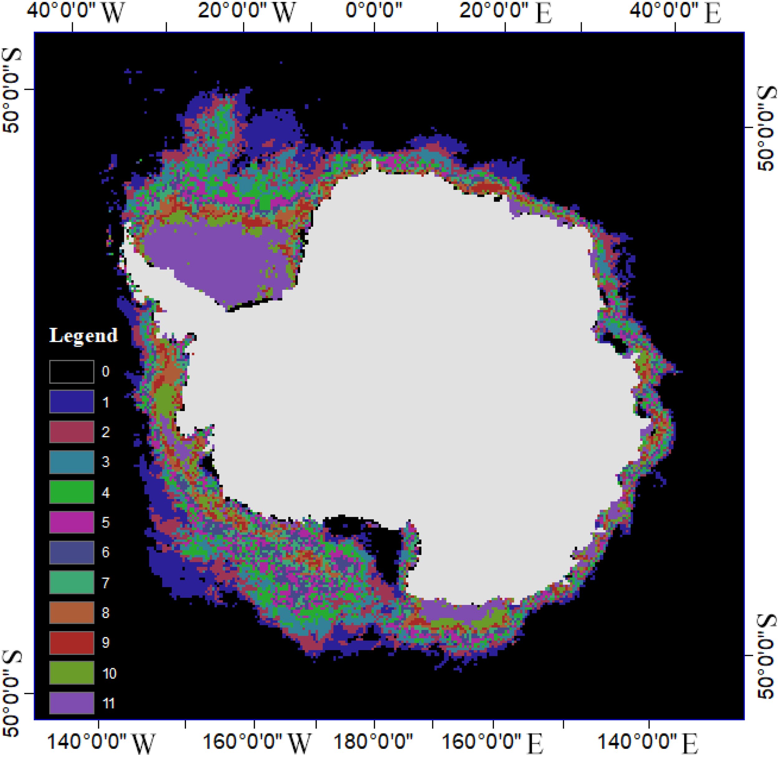Spatial changes of Antarctic sea ice distribution (Unit: days).