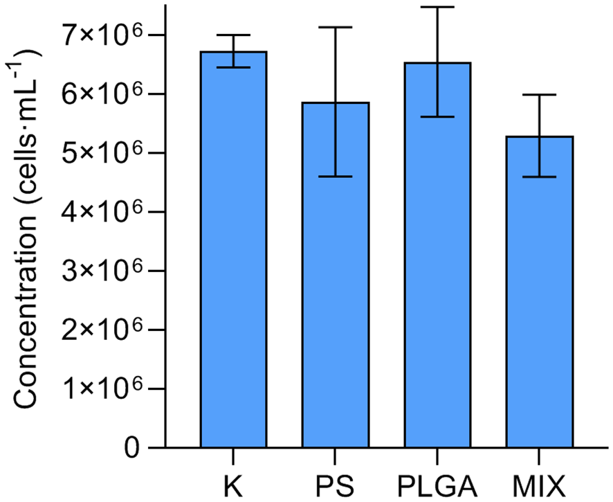 Bacterial concentration (mean ± standard deviation, n=3) at the end of the experiment (day 11) in the treatments. K: control; PS (polystyrene); PLGA (biodegradable MP); MIX (mixture of PS+PLGA).
