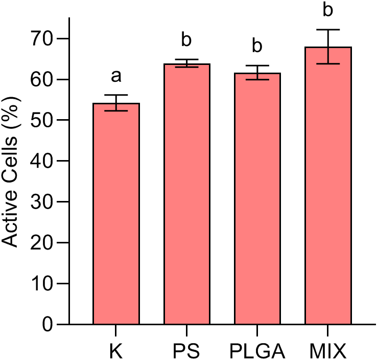 Percentage of active bacteria (mean ± standard deviation, n=3) at the end of the experiment (day 11) in the treatments. K: control; PS (polystyrene); PLGA (biodegradable MP); MIX (mixture of PS+PLGA).