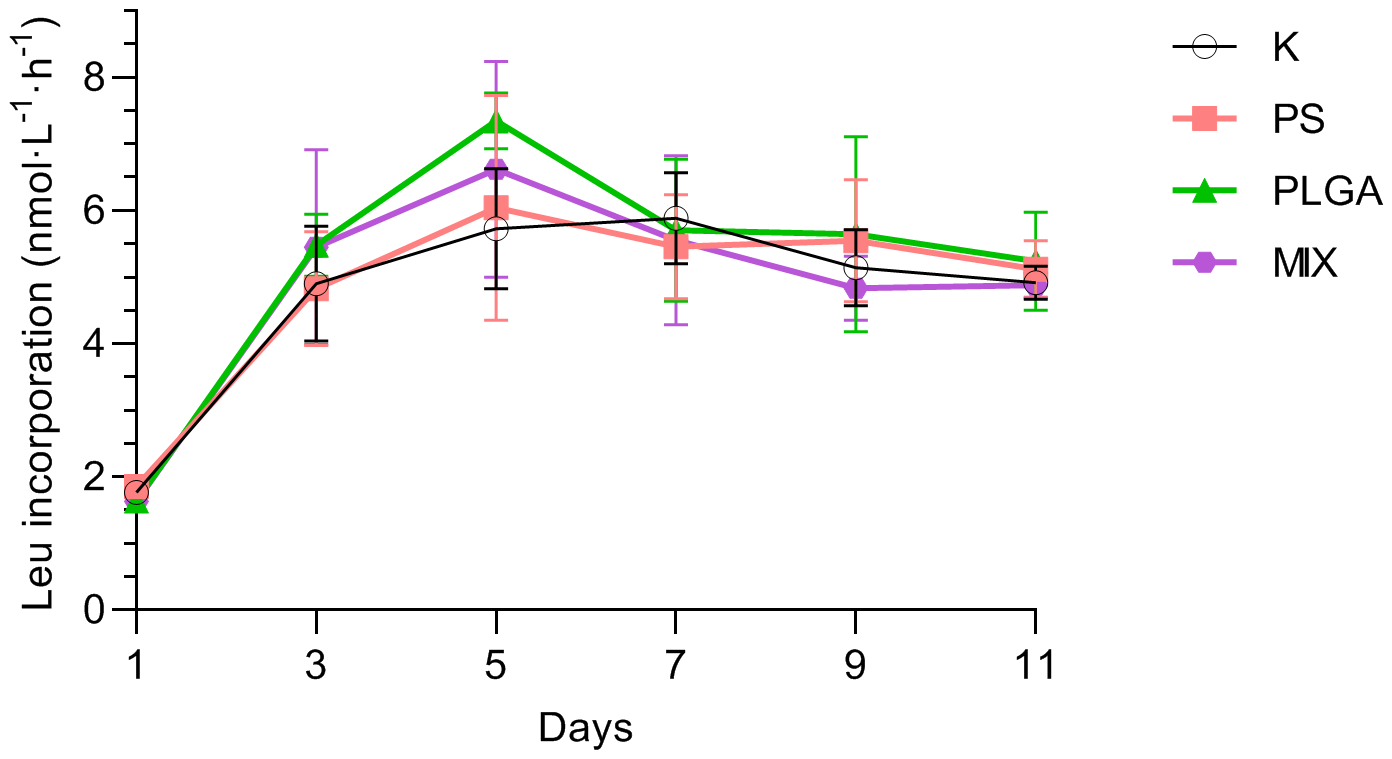 Total leucine incorporation (mean ± standard deviation, n=3) during the experiment. K: control; PS (polystyrene); PLGA (biodegradable MP); MIX (mixture of PS+PLGA).