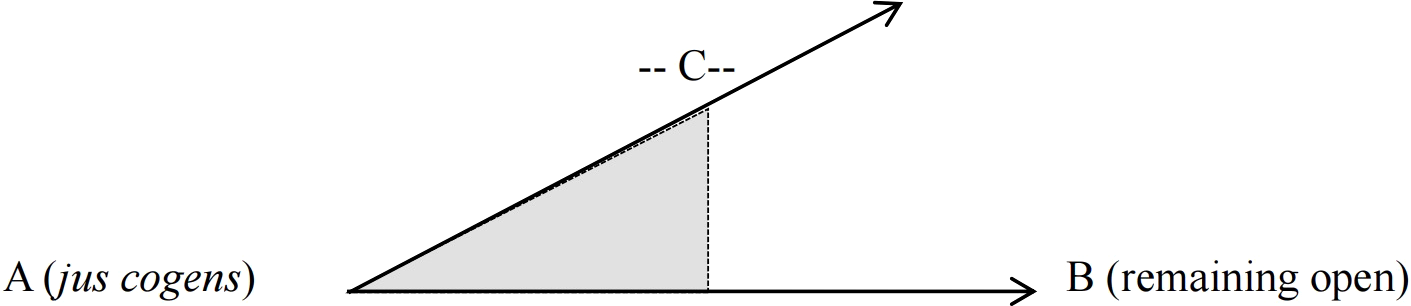 One end (point A) was fixed by preventing the use of force. To different extents, Articles 51 and 52 of the Vienna Convention invalidate treaties procured through the unlawful use of force. The species was established as jus cogens. Treaties within the shaded zone might be unequal treaties, or they might merely be asymmetric bargained agreements. This depends on how line C (representing the degree to which the parties are unbalanced in bargaining) moves along the ray. The indicator NH provides a playing field in which the status of parties can change and, in so doing, can bring about a change in the content of provisions. This happens when a strong power incidentally suffers from an unexpected development that decreases its bargaining strength and increases its willingness to accept less beneficial arrangements than those it had once hoped for. This change may have saved the treaty from potential charges of inequality.