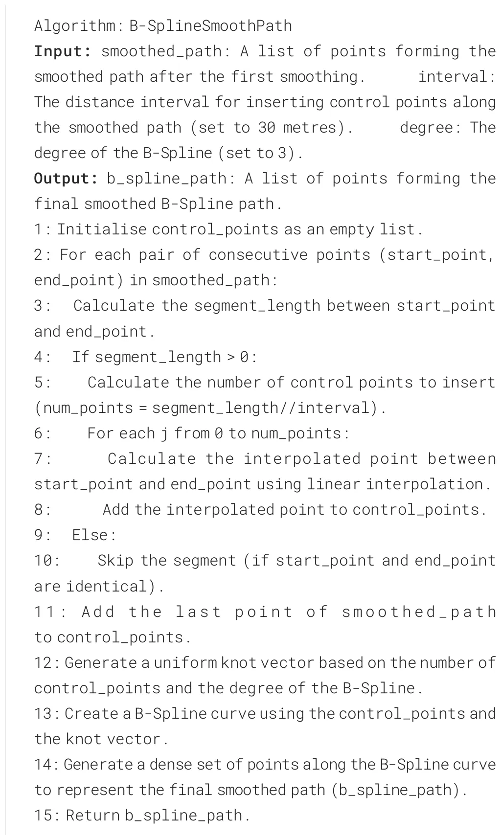 After the initial smoothing by the Bresenham algorithm, although redundant nodes and sharp turns have been partially reduced, significant angular changes may persist. These changes can lead to large turning angles, increasing energy consumption and operational difficulty for USVs during actual operation. To further optimise the smoothness and continuity of the path, a path smoothing method based on cubic B-splines (Muñoz, 2008) was introduced in the second stage of the DPSS. The mathematical definition of the B-spline curve is shown in Equation 12: