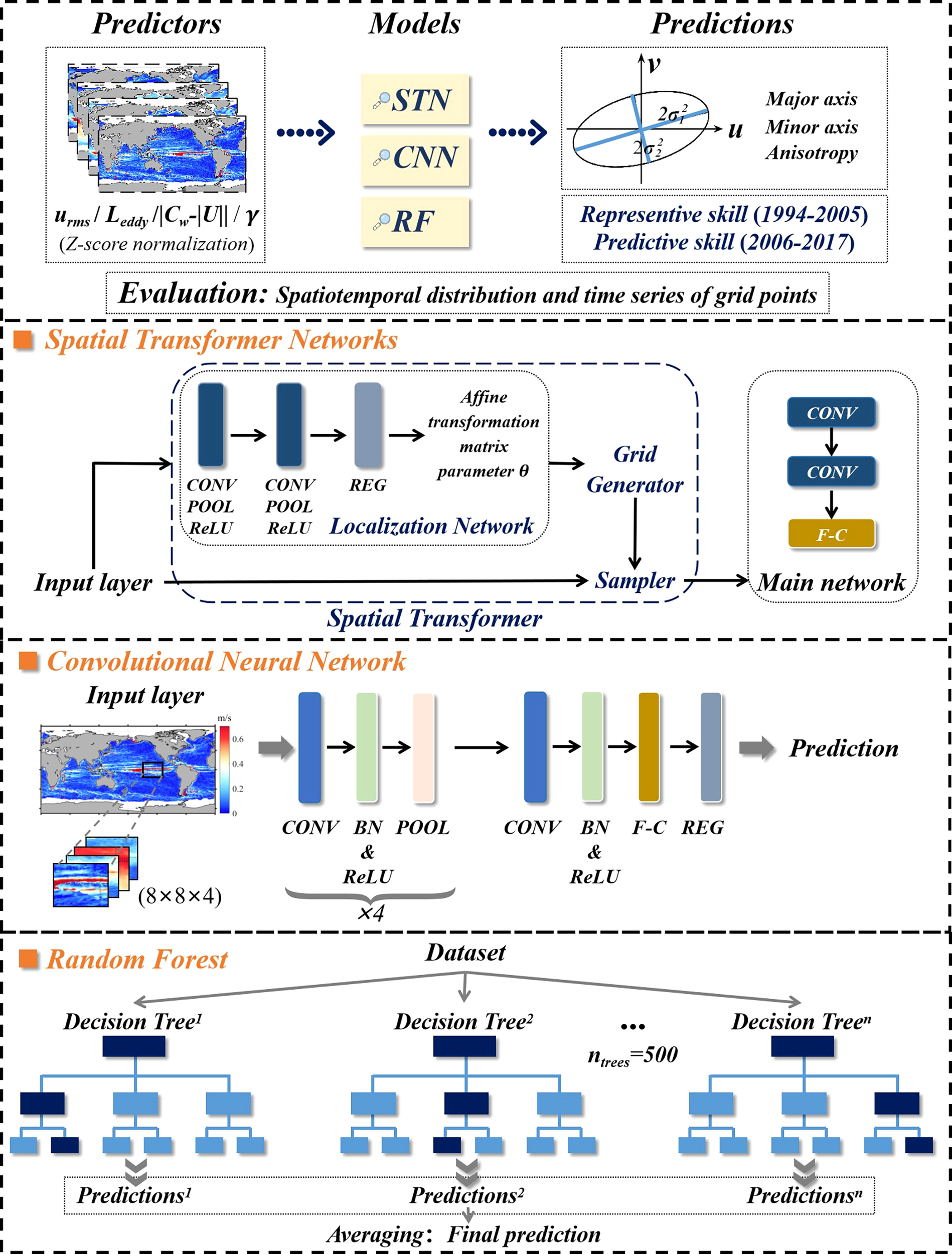 We apply three algorithms, STN, CNN, and RF, to predict mixing-ellipse attributes, each offering distinct advantages. The STN approach incorporates a spatial attention mechanism into a CNN framework, enabling robust image recognition under affine transformations such as scaling, rotation, and cropping. This self-supervised, end-to-end process has proven effective in other fields (e.g., Jaderberg et al., 2015; Mirmohammadsadeghi et al., 2017; Sinclair et al., 2022). The CNN approach extracts spatial features from input images through convolutional operations. CNN-based methods, including their variants, have demonstrated success in various applications, such as ship detection and classification (e.g., Guan et al., 2023; Gao et al., 2023a, d, 2024a). The RF approach can improve prediction accuracy through an ensemble of decision trees, each constructed by randomly selecting features at each split. This method is computationally efficient, resistant to overfitting, and has been successfully applied to predict across-stream eddy diffusivities (e.g., Ho, 1995; Su et al., 2018; Guan et al., 2022).