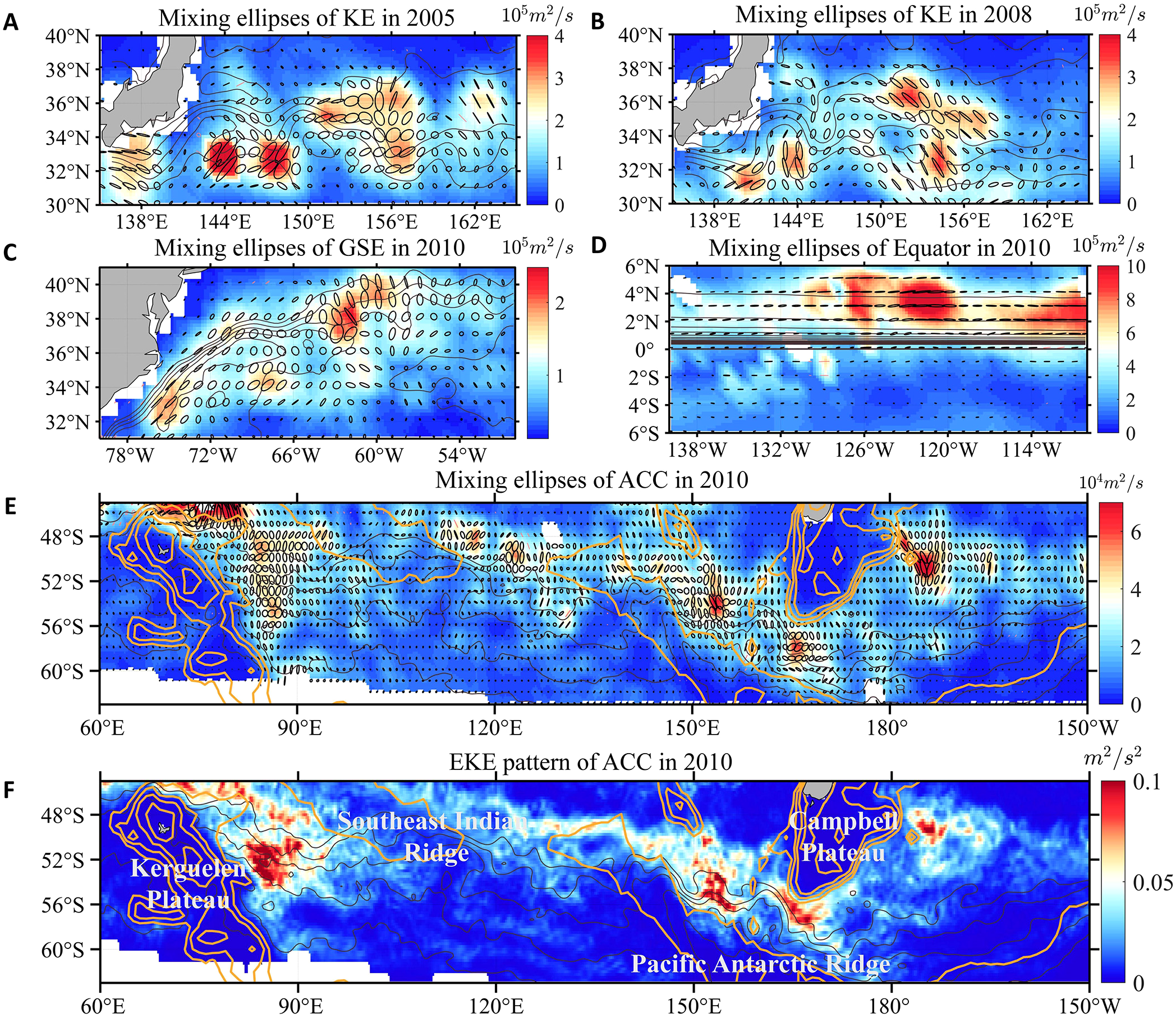 Mixing ellipses in four key regions: (A) KE in 2005, (B) KE in 2008, (C) GSE in 2010, (D) Equatorial Region in 2010, (E) ACC in 2010. (F) Spatial pattern of eddy kinetic energy of ACC in 2010 with the topography. Brown lines represent barotropic streamlines, as defined by ψg = gf−1η, with η denoting annual-mean sea surface height, where g is the gravitational acceleration, and f denotes the Coriolis parameter. The colorbar shows the major axis length (m2/s), with axes of ellipses scaled down for visualization of their orientation relative to streamlines. The orange contours denote 500-, 1500-, 2500-, 3500-m bathymetry contours.