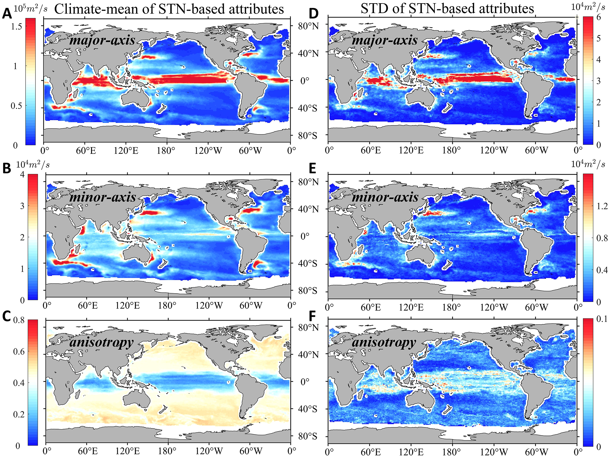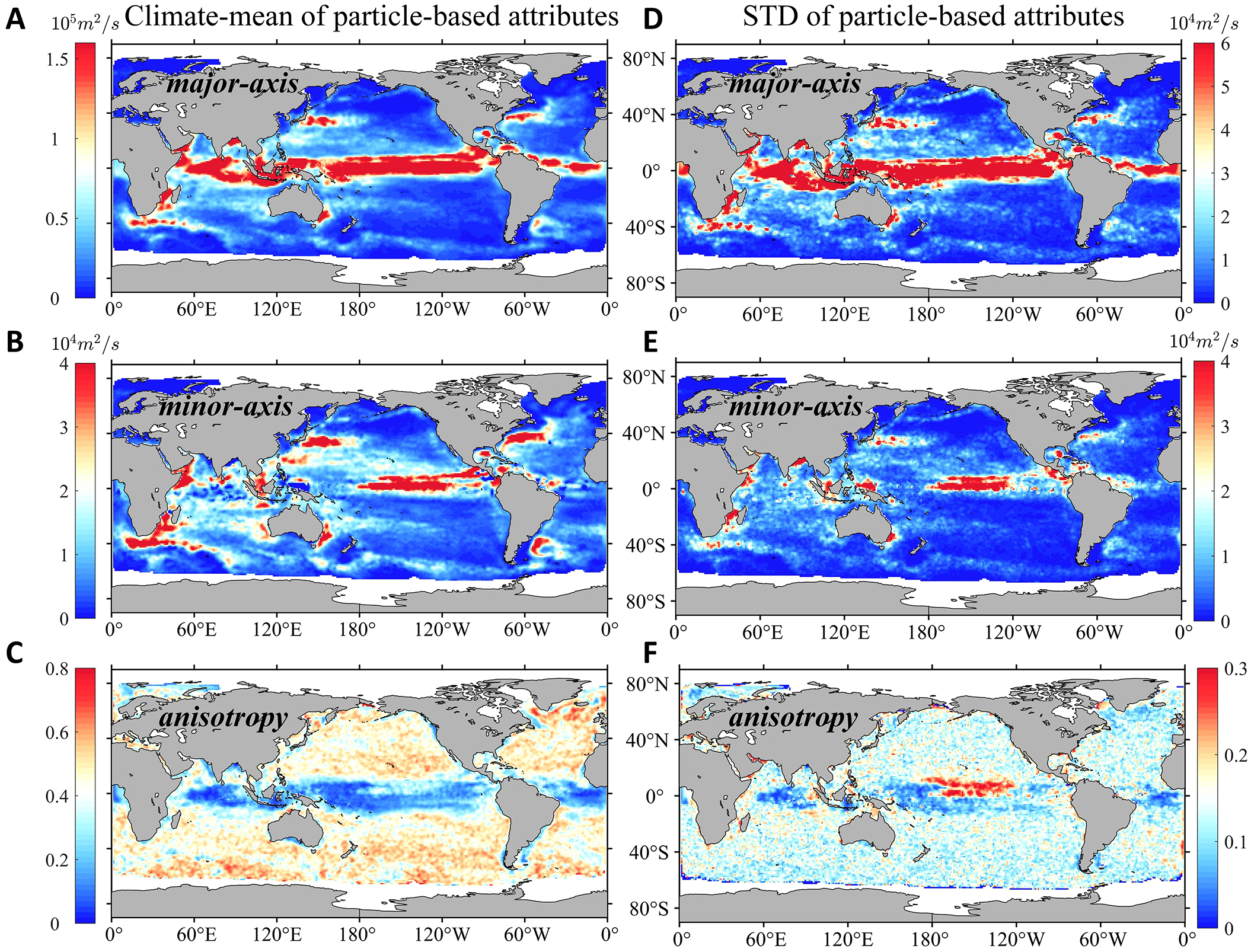 The climate-mean values of (A) major axis length (B) minor axis length (C) anisotropy and the standard deviation (STD) of (D) major axis length (E) minor axis length (F) anisotropy during 2006-2017 based on Lagrangian single-particle method.