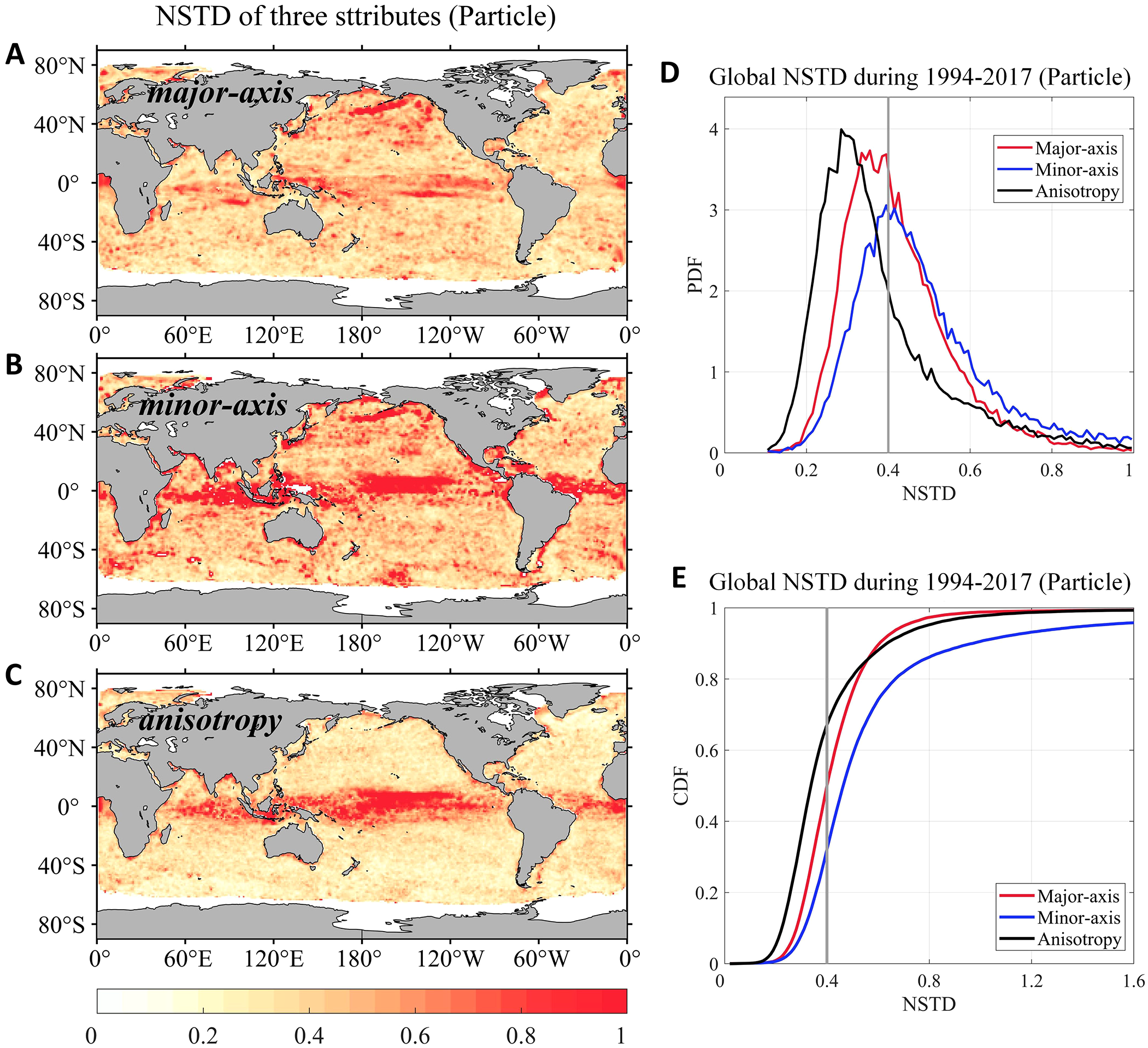 The normalized standard deviation (NSTD) of annual-mean particle-based attributes spanning from the year 1994-2017. Spatial pattern of NSTD of (A) major axis length (B) minor axis length (C) anisotropy. (D) Probability density function (PDF) and (E) the cumulative density function (CDF) of the NSTD from (A-C). The gray vertical lines in (D, E) indicate the NSTD value of 0.4.