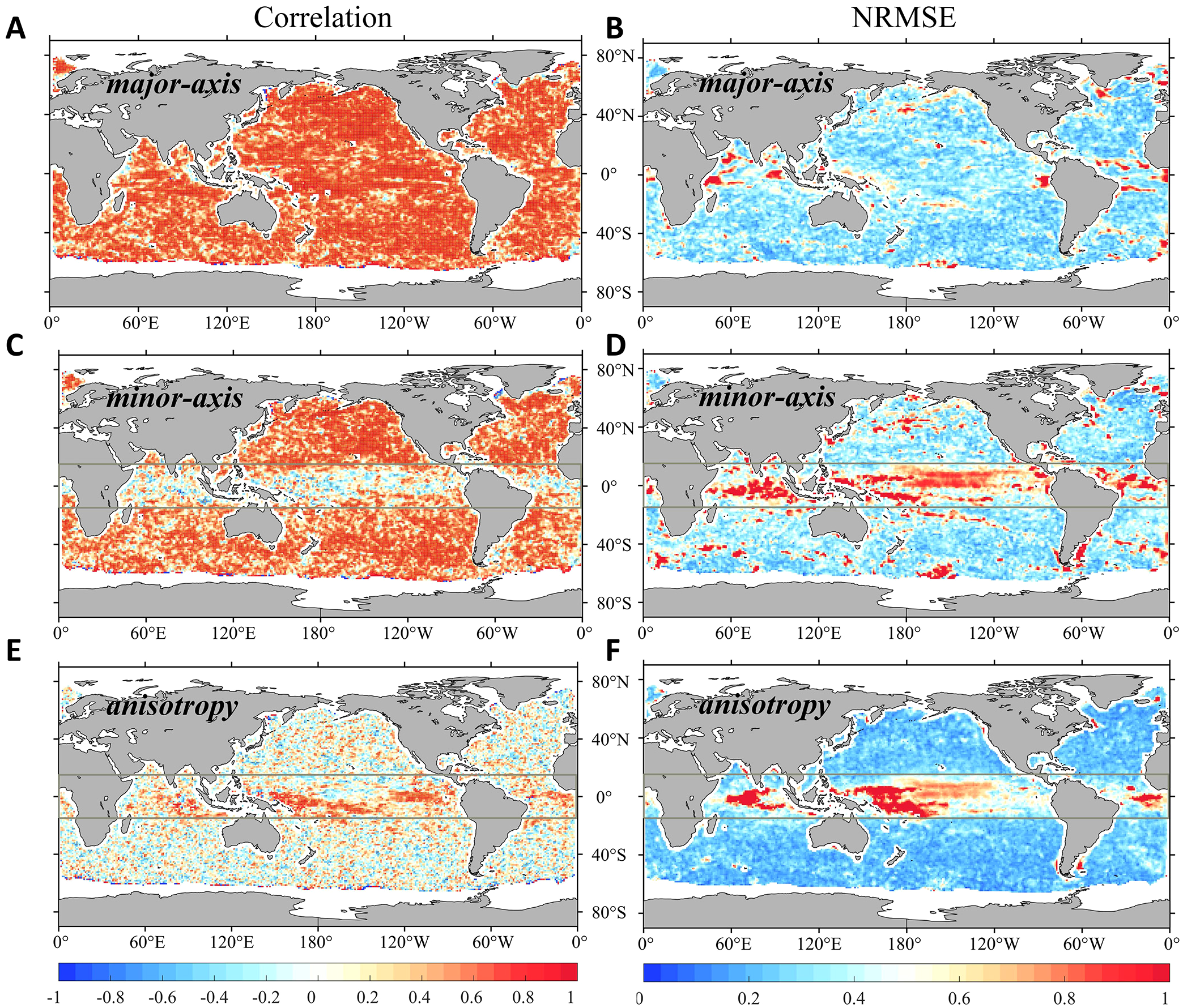The correlation coefficients (left panel) and NRMSE (right panel) between particle-based and machine learning (ML)-based time series at global grid points spanning from 2006-2017 for (A, B) major axis, (C, D) minor axis and (E, F) mixing anisotropy. (A-D) shows the predictive skill of RF model and (E, F) shows the predictive skill of STN model. The zonal gray lines indicate those region within 15°N and 15°S. Dots in (A, C, E) indicate points where the correlation coefficient passes the 95% confidence level.