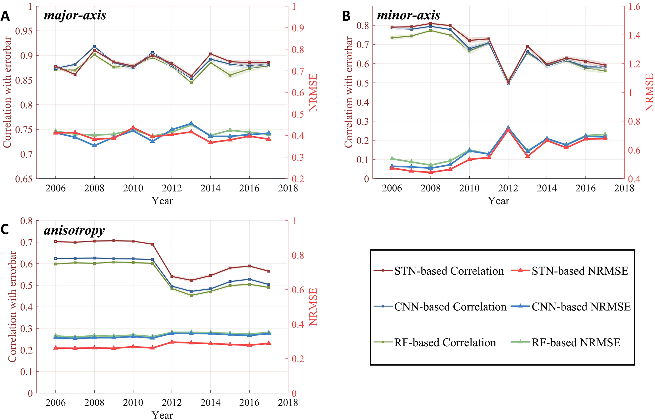 Spatial correlation and Normalized Root Mean Square Error (NRMSE) between particle-based attributes of mixing ellipses and those from RF, CNN and STN methods. Results during 2006-2017 showcase the predictive skill for (A) major axis length, (B) minor axis length and (C) anisotropy, respectively. Error bars of correlation coefficients, represented by the shaded region, are uncertainties at the 95% confidence level inferred from a bootstrapping method (Guan et al., 2022). These uncertainties are too small to be clearly visible in the figures.