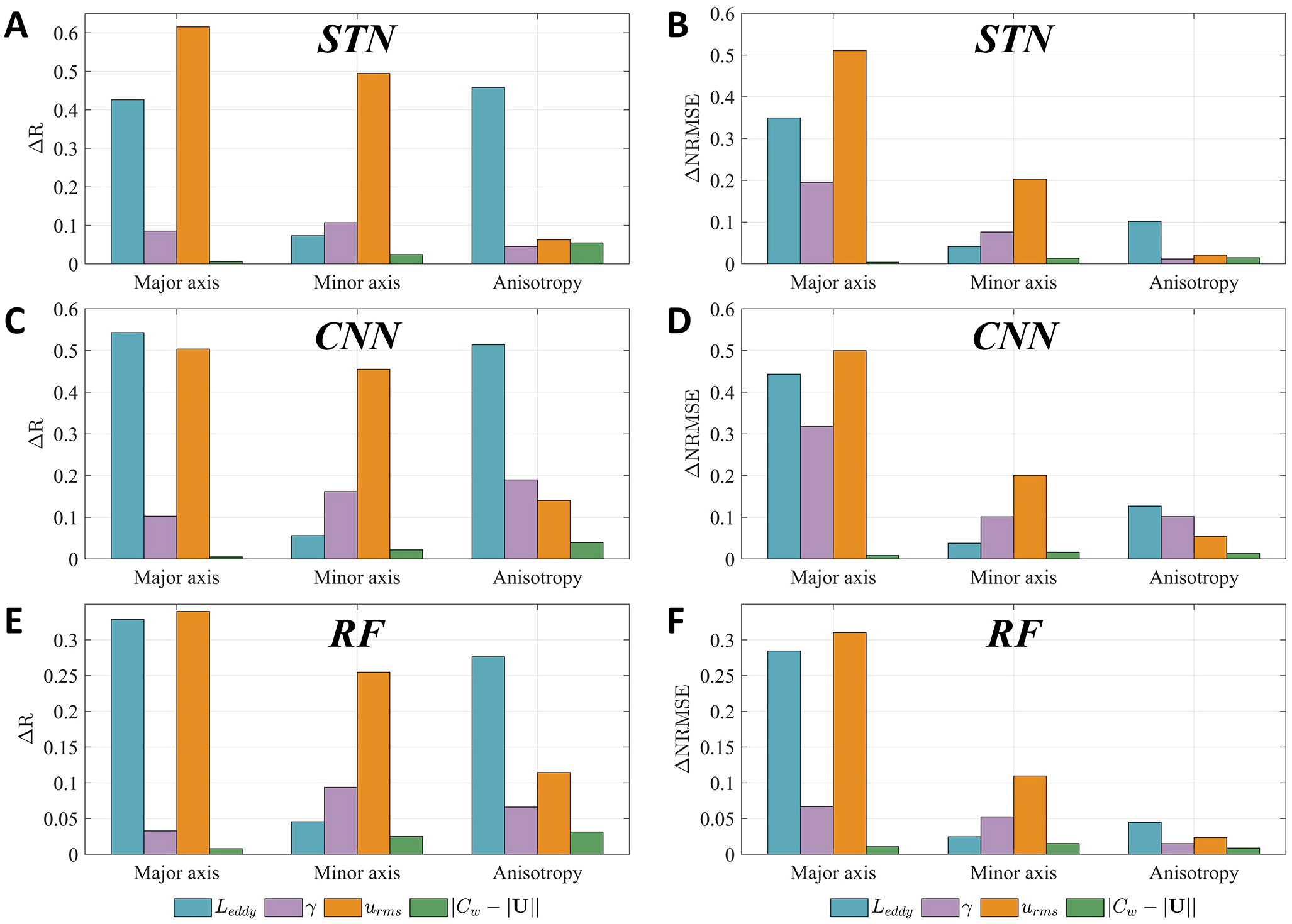 We evaluated the feature importance rankings for predicting the major axis, minor axis, and anisotropy of mixing ellipses using all three models. The values of ΔRMSE and ΔR for each model are shown in Figure 9. The rankings based on these metrics are consistent across the models. For the STN model (Figures 9A, B), urms and Leddy have the greatest impact on predicting the major axis and mixing anisotropy. This aligns with eddy mixing length theory (Taylor, 1915), where eddy diffusivity is proportional to the product of urms and mixing length. Previous studies have assumed that mixing length scales with Leddy (Stammer, 1998; Eden and Greatbatch, 2008; Bates et al., 2014) and Klocker and Abernathey (2014) confirmed that this theory is reasonable for weak mean flows. For the minor axis, urms and additional factor γ, proportional to urms/Leddy (Equation 11) in SMLT, ranks the first and second. Among the four predictors, consistently ranks as the least important for predicting the axes but ranks third for anisotropy. Interestingly, in the CNN model, γ ranks as the second-most important predictor for anisotropy, and in the RF model, it ranks third. This difference likely arises from the distinct architectures and data processing algorithms of these models.