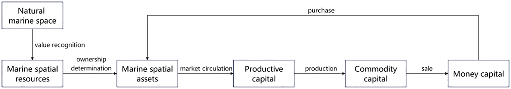 Integrating marine space into the mariculture production process as a means of production is the final step in its capitalization. This step is the one that realizes value and surplus value creation, and thus the purpose of capitalization. In the case of aquaculture, in addition to the acquired marine space, monetary capital also needs to purchase other means of production and thus be converted into productive capital. Through mariculture, productive capital is converted into commodity capital in the form of farmed seafood. After the sale, the commodity capital is converted back into money capital, realizing capital appreciation and recycling and preparing for the next round of capital recycling.