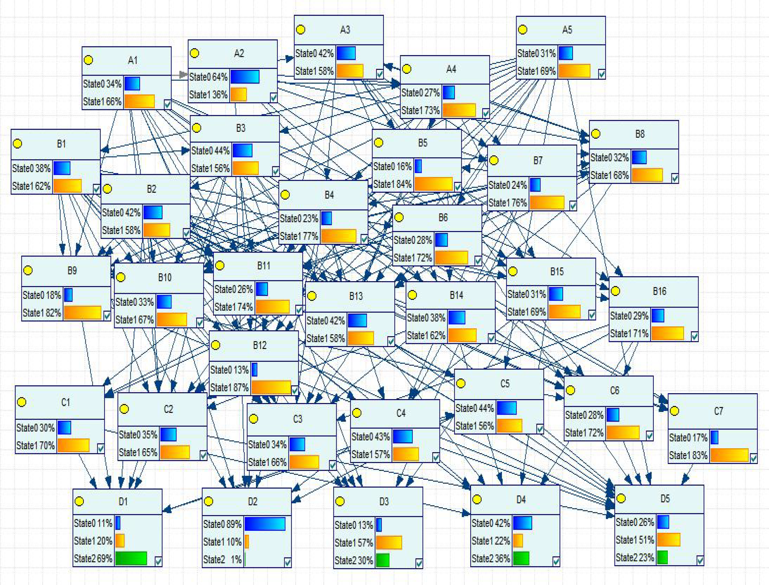 In Equation 19, P(C) indicates the probability of C occurrence without evidence support, which is the prior probability; P(C/D) indicates the known query variable, that is, the evidence variable is D, the probability of C occurrence is the posterior probability, and the prediction inference result in the prediction model is the posterior probability. P (D/C) represents the conditional probability distribution for the initial given node, which is the likelihood function. In the disaster chain complex network, it refers to the occurrence probability for the latter disaster event node when the previous disaster event node occurs/does not occur.