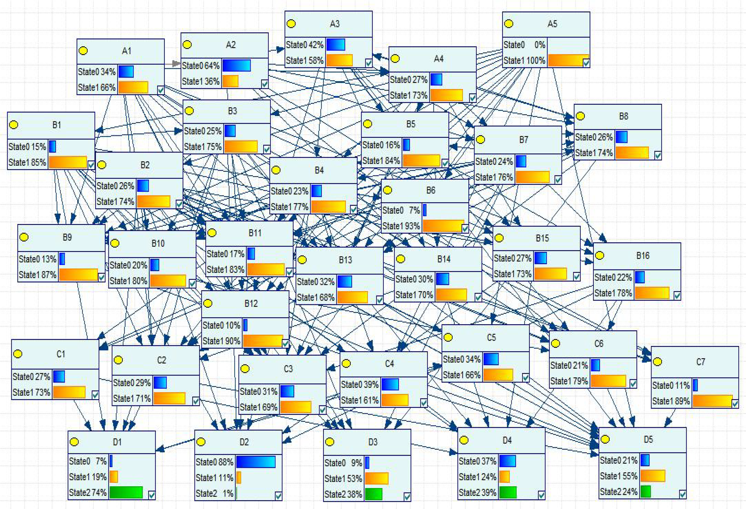 (3) The model based on BNs for predicting the evolutionary process of the storm surge disaster chain in a complex network dynamically illustrates the dynamic evolution process of a disaster chain, achieving the prediction of disaster event triggering rate and node scenarios.