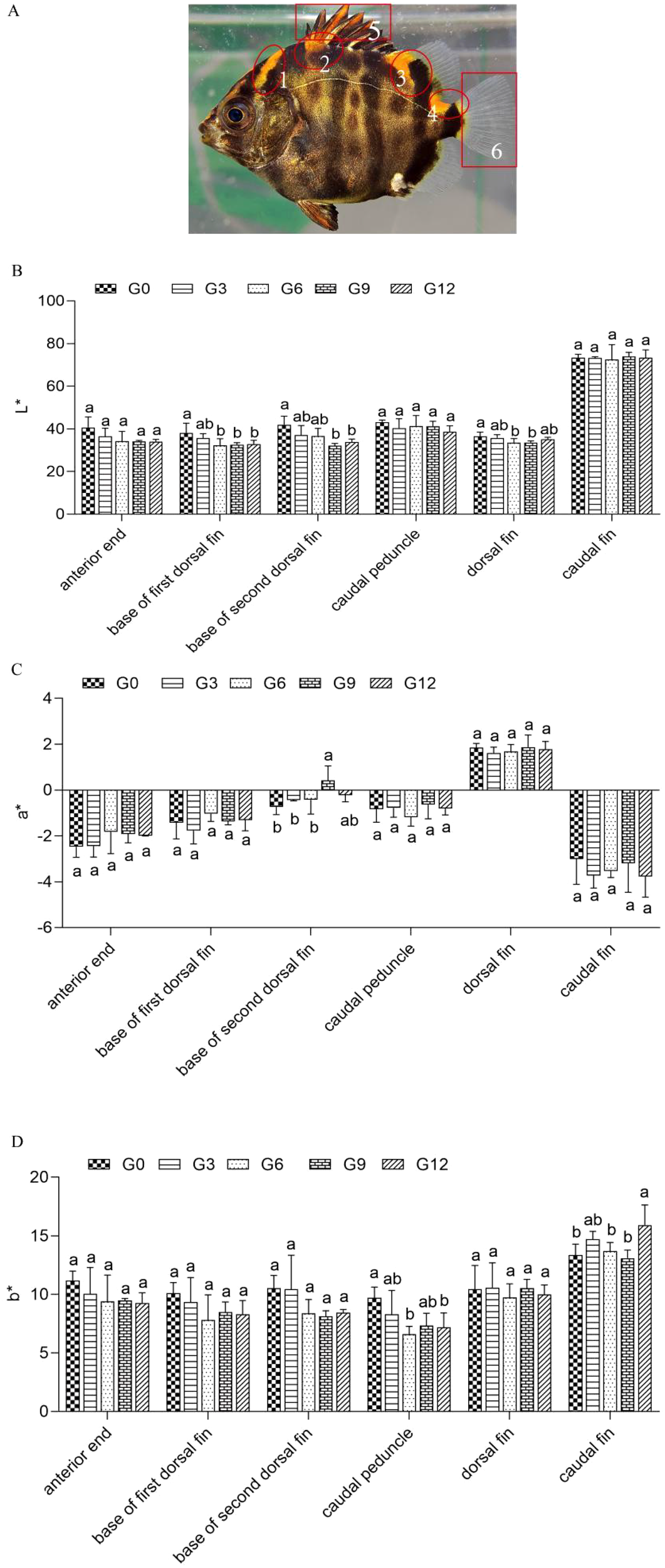 L*, a* and b* colorimetric values in spotted scat fed with diets containing different dosages of Lianjiang red orange peels. (A) Sample of skin region for measuring L*, a* and b* colorimetric values in spotted scat. Numbers 1, 2, 3, 4, 5, and 6 represent anterior end, base of the first dorsal fin, the joint of the first and second dorsal fin, the joint of second dorsal and caudal fin, dorsal fin and caudal fin, respectively. The comparative analysis (B) L*, (C) a* and (D) b* value in spotted scat. Date were expressed as mean ± SE (n=3), the different superscript letters above error bar represent the significant difference between different groups (P < 0.05).