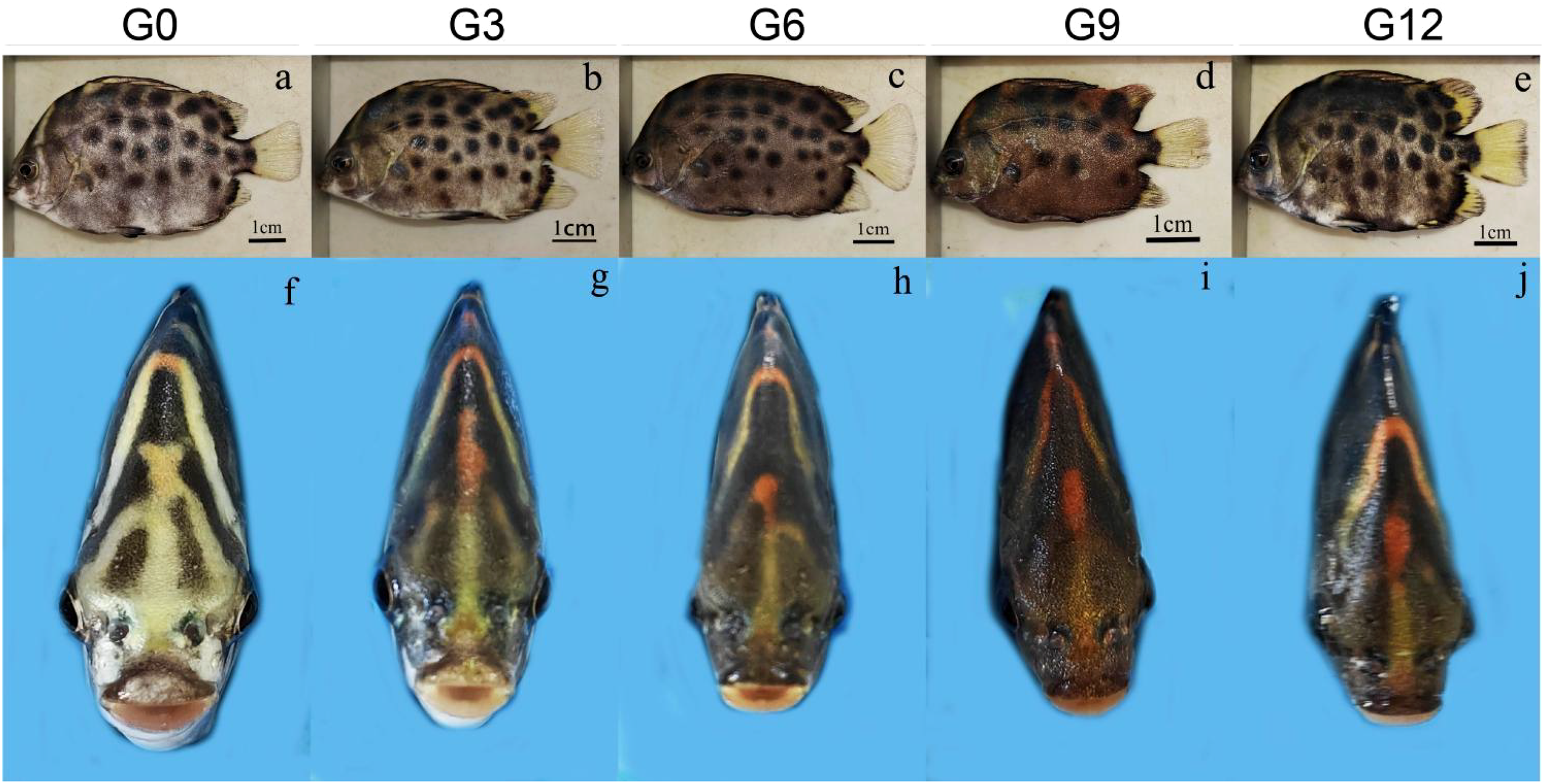 Body color of spotted scat fed with diets containing different dosages of Lianjiang red orange peels. The side (A–E) and frontal (F–J) views of the red body regions in spotted scat. The background of the (F–J) diagram of the front view is filled with blue using Photoshop CC 2019 (version 20.x).