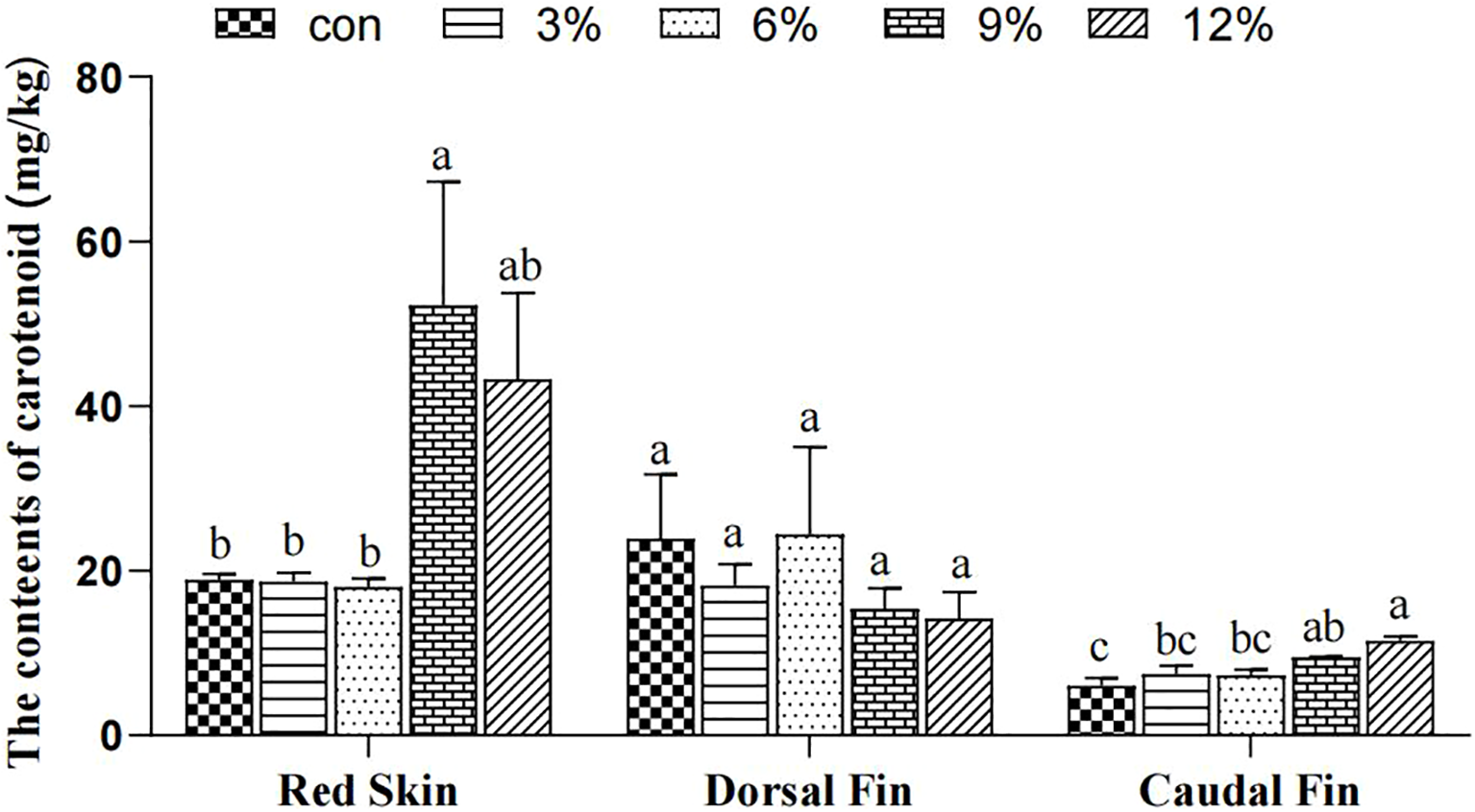 The total carotenoids of fish skin are expressed as means ± standard error (SE) (n = 3). The data were analyzed by one-way ANOVA and Duncan’s Multiple Range test. Statistical analysis was performed using SPSS Version 25 at a significance level of 0.05.